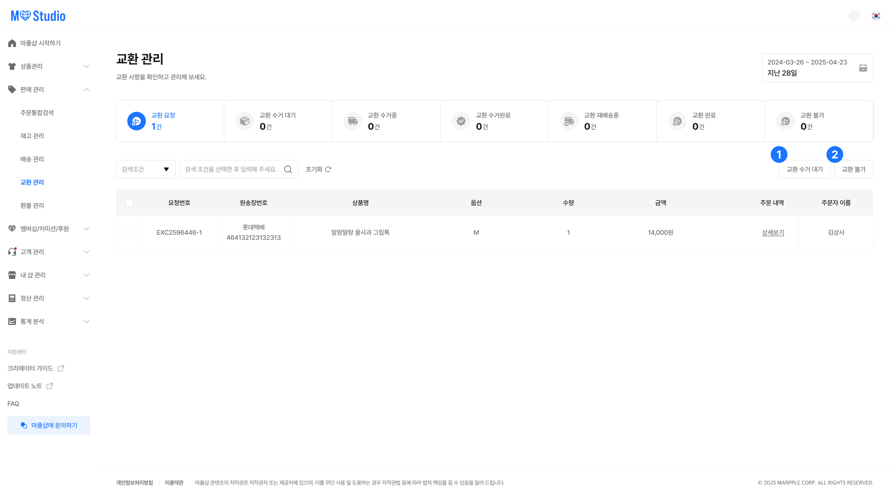 크리에이터 배송 상품에 대한 교환 요청이 접수되면, 판매자는 교환 관리 페이지에서 요청 사유와 수량을 확인한 뒤 교환 승인 또는 교환 불가 처리 및 상태 변경을 진행할 수 있습니다.