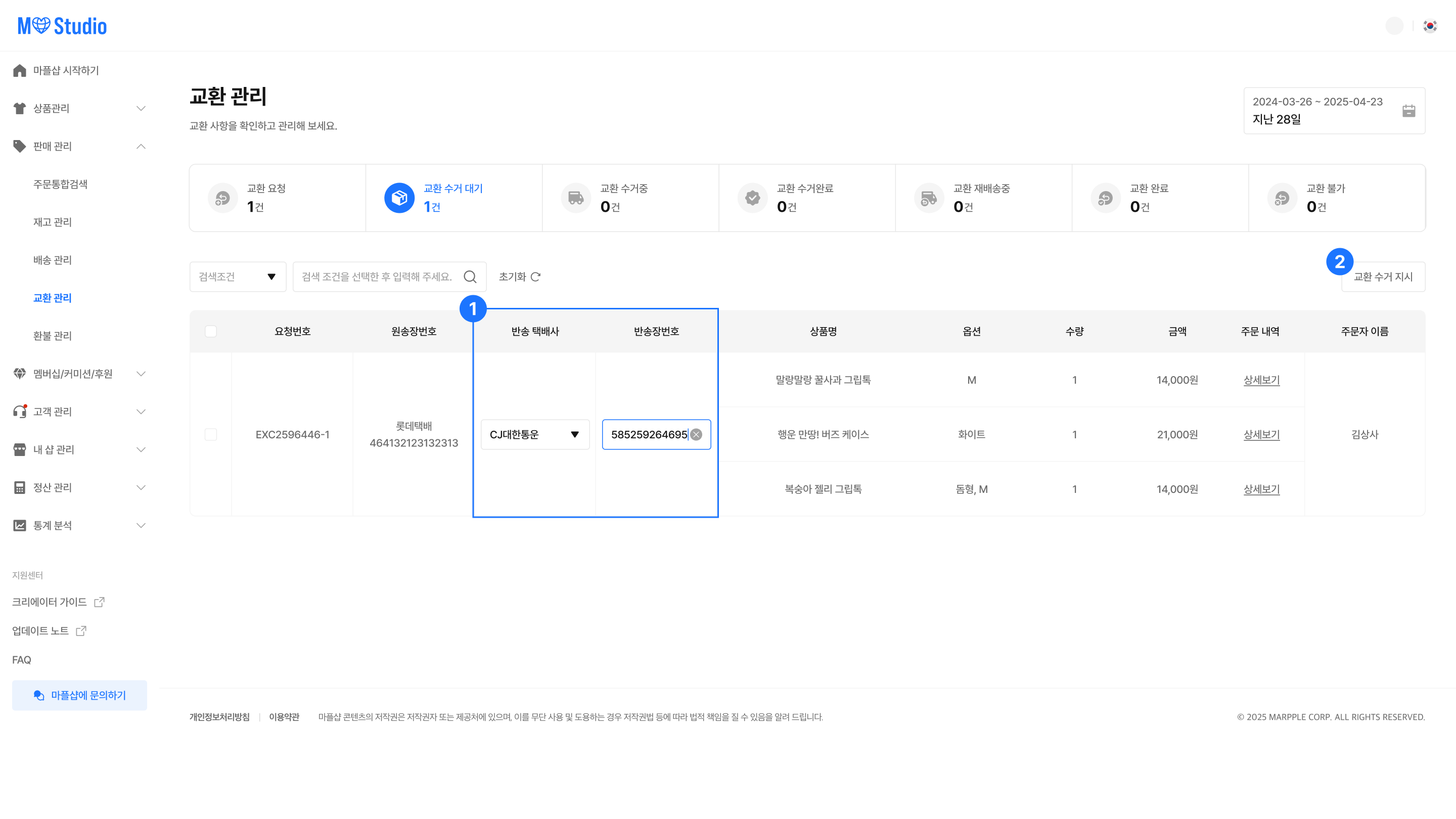이후 교환 여부는 수거된 상품을 판매자가 직접 확인한 뒤 판단해 상태를 변경해야 합니다.