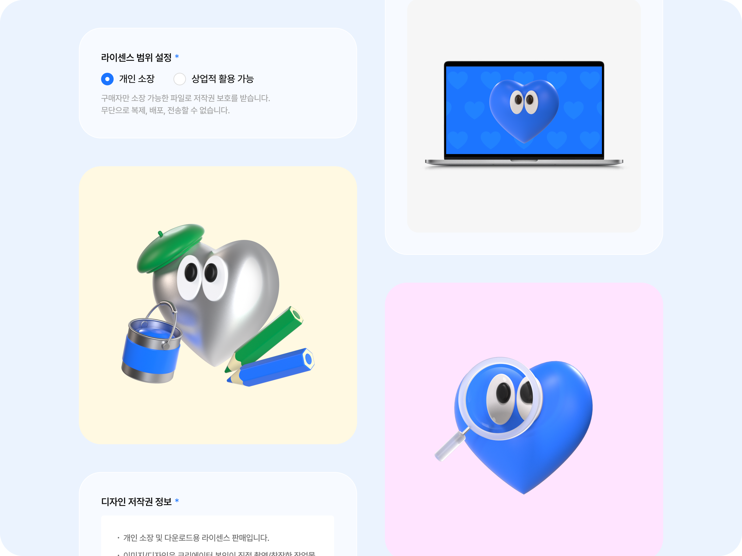 크리에이터님이 판매하고자 하는 디지털 상품의 라이선스 범위를 개인 소장 용도로 설정하여 판매하였을 경우, 해당 상품의 구매자는 개인 소장 용도로만 활용하여야 합니다.