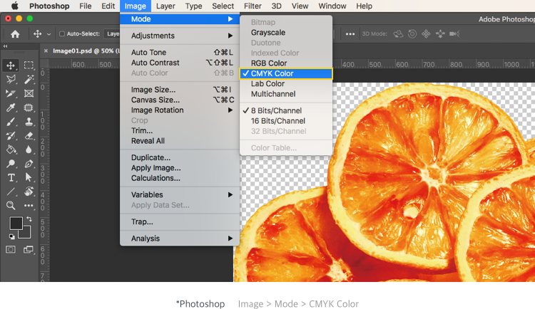 1. 파일을 열고 [이미지(image)] > [모드(Mode)] > [CMYK 색상(CMYK Color)]를 선택해 주세요.