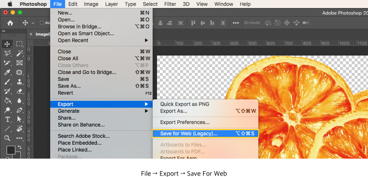 2. 배경이 없는 이미지 그대로 컬러모드 변경이 완료되면, [파일(File)] > [웹(Web)용으로 저장하기 (Save for Web)]을 선택해 주세요.
