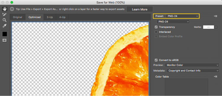 3. 저장을 위한 새 창에서 [품질(Preset)]을 PNG-24로 변경하고 저장해 주세요.