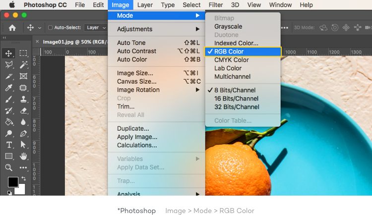 1. 파일을 열고, [이미지(Image)] > [모드(Mode)] > [RGB 색상(RGB Color)]로 설정되어 있는지 확인해 주세요.
