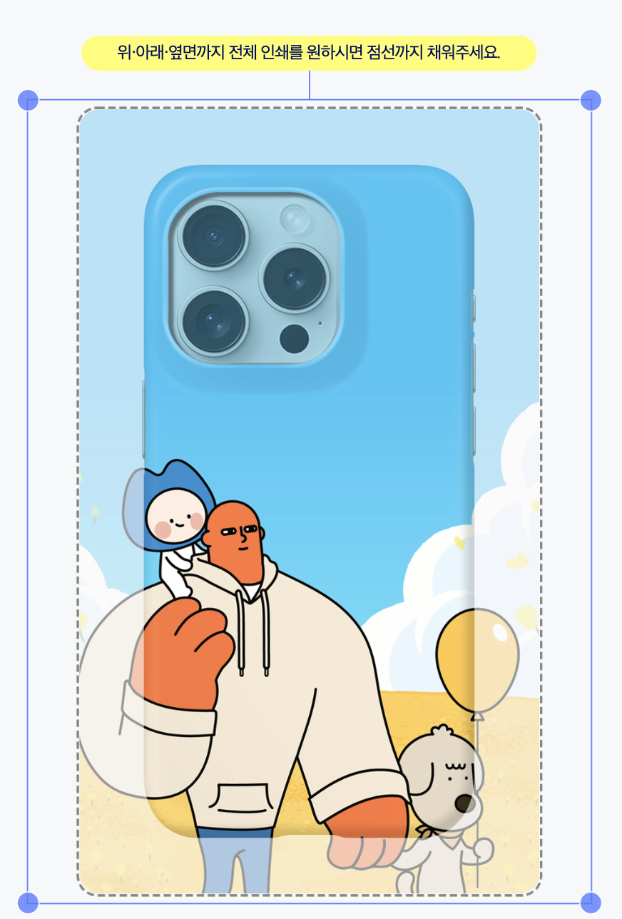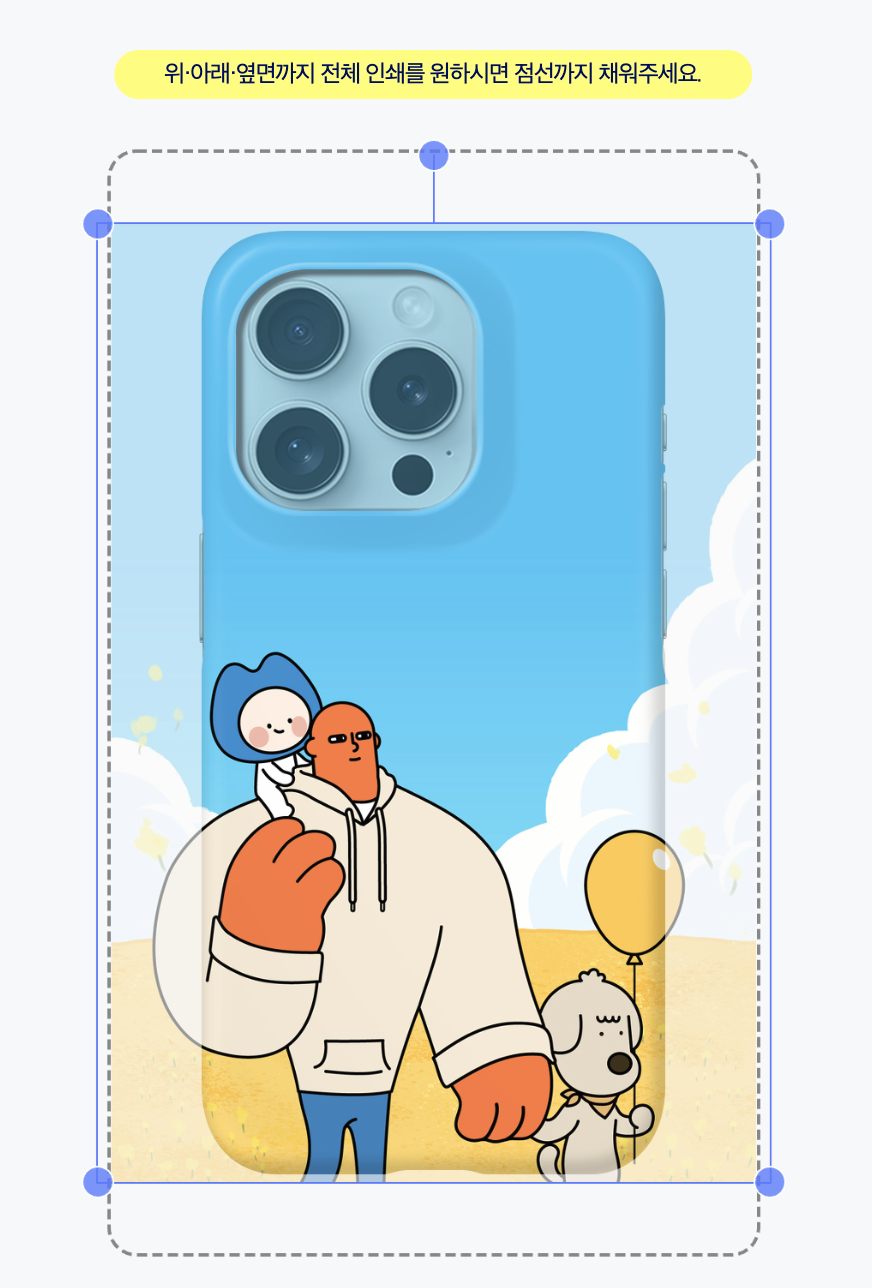 이와 같이 점선 안쪽이 도안으로 다 채워져 있지 않은 경우, 비어 있는 부분이 폰케이스 무지 색상으로 나타날 수 있습니다.