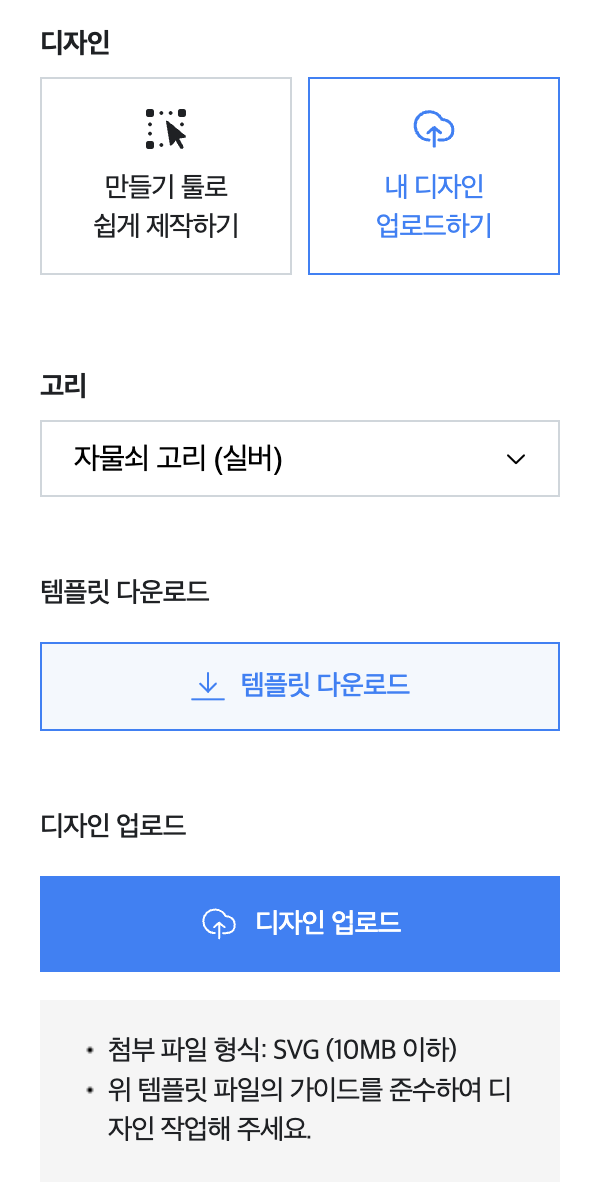 만약 저장하신 SVG 파일 업로드가 어려울 시, 번거로우시더라도 상위 버전의 일러스트레이터를 사용하시거나 [만들기 툴로 쉽게 제작하기]를 통해 PNG로 도안을 업로드해 주세요.