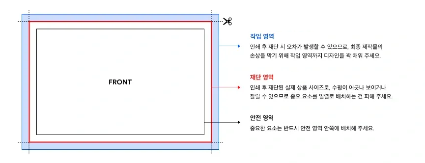 안전 영역은 공정상 발생하는 인쇄/제작 밀림에도 반드시 인쇄되어야 하는 디자인 요소가 문제 없이 제작 될 수 있습니다.