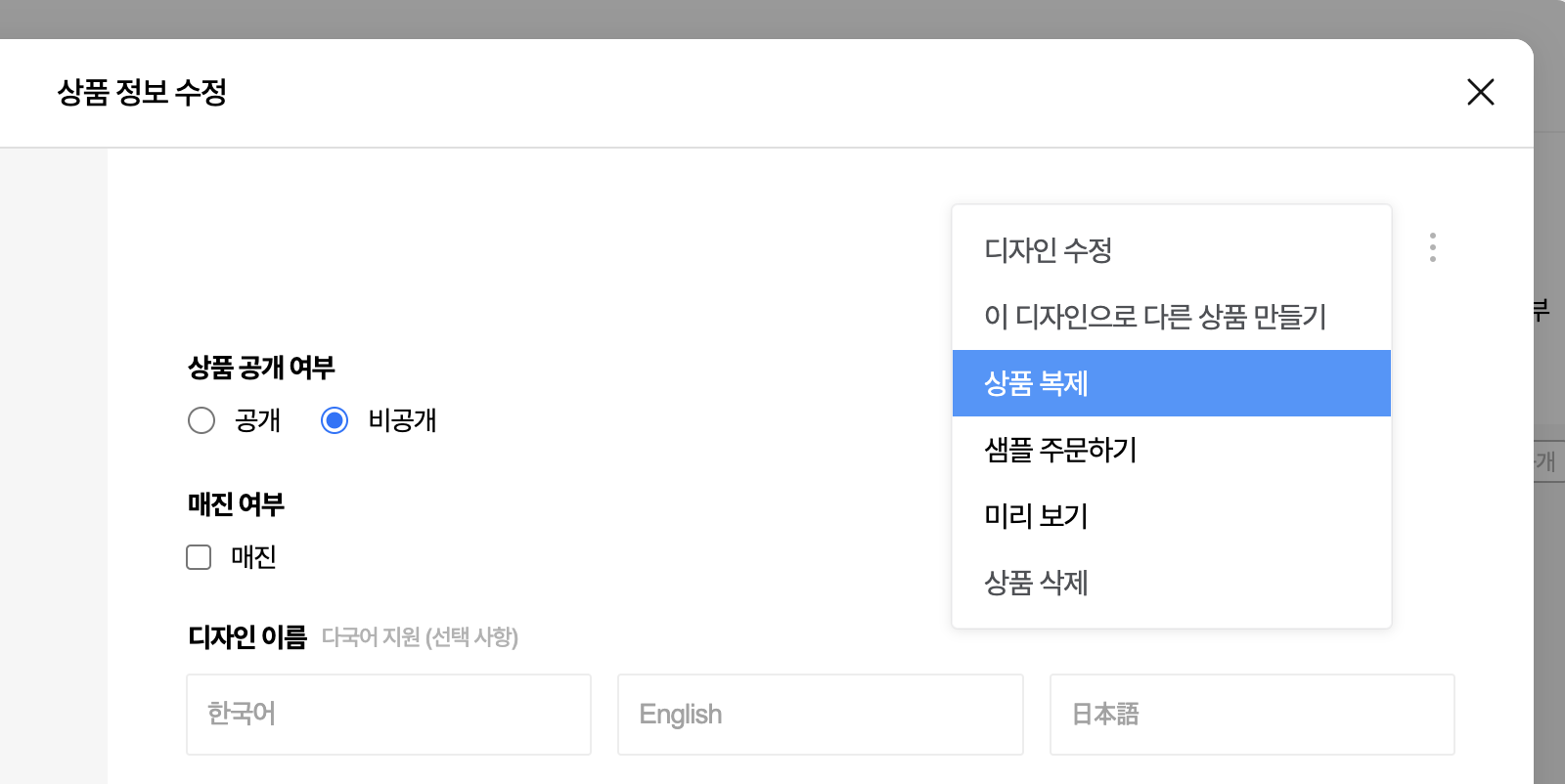 [완료] 버튼 우측 점 3개 메뉴(⋮) 클릭 > [상품 복제]