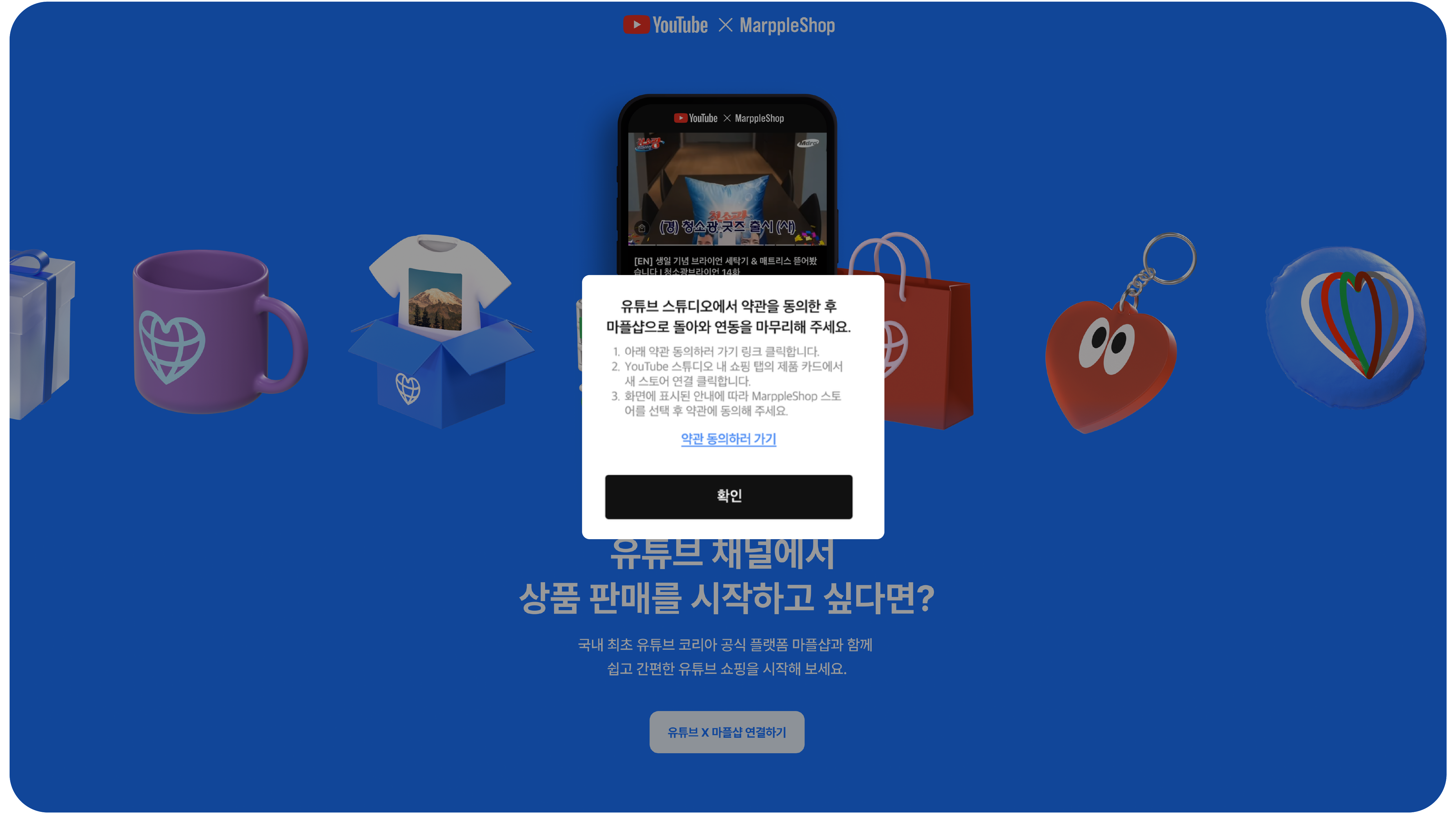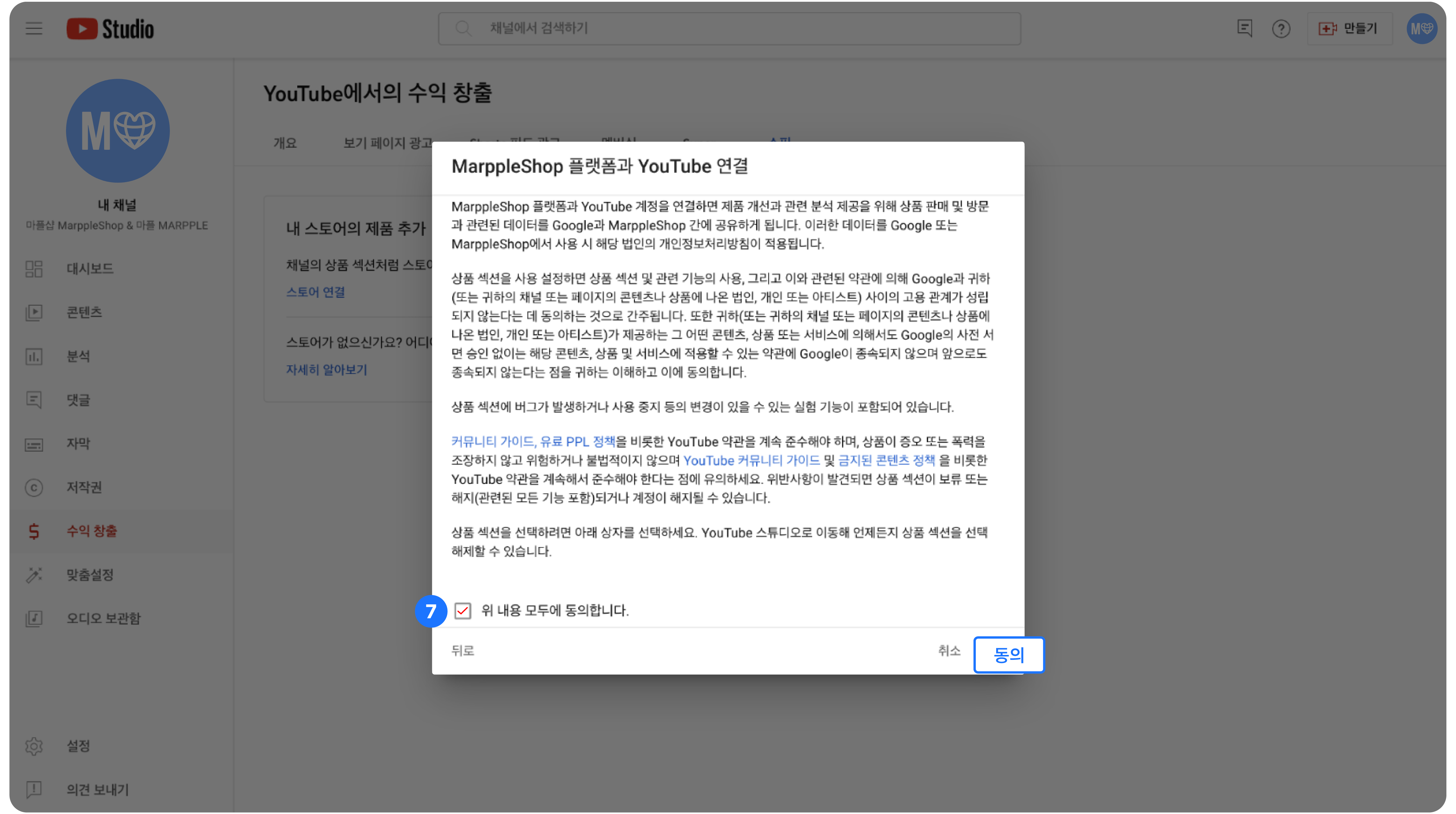 'MarppleShop 플랫폼과 YouTube 연결' 약관 팝업이 발생하면 [위 내용에 모두 동의합니다] 체크 > [동의]