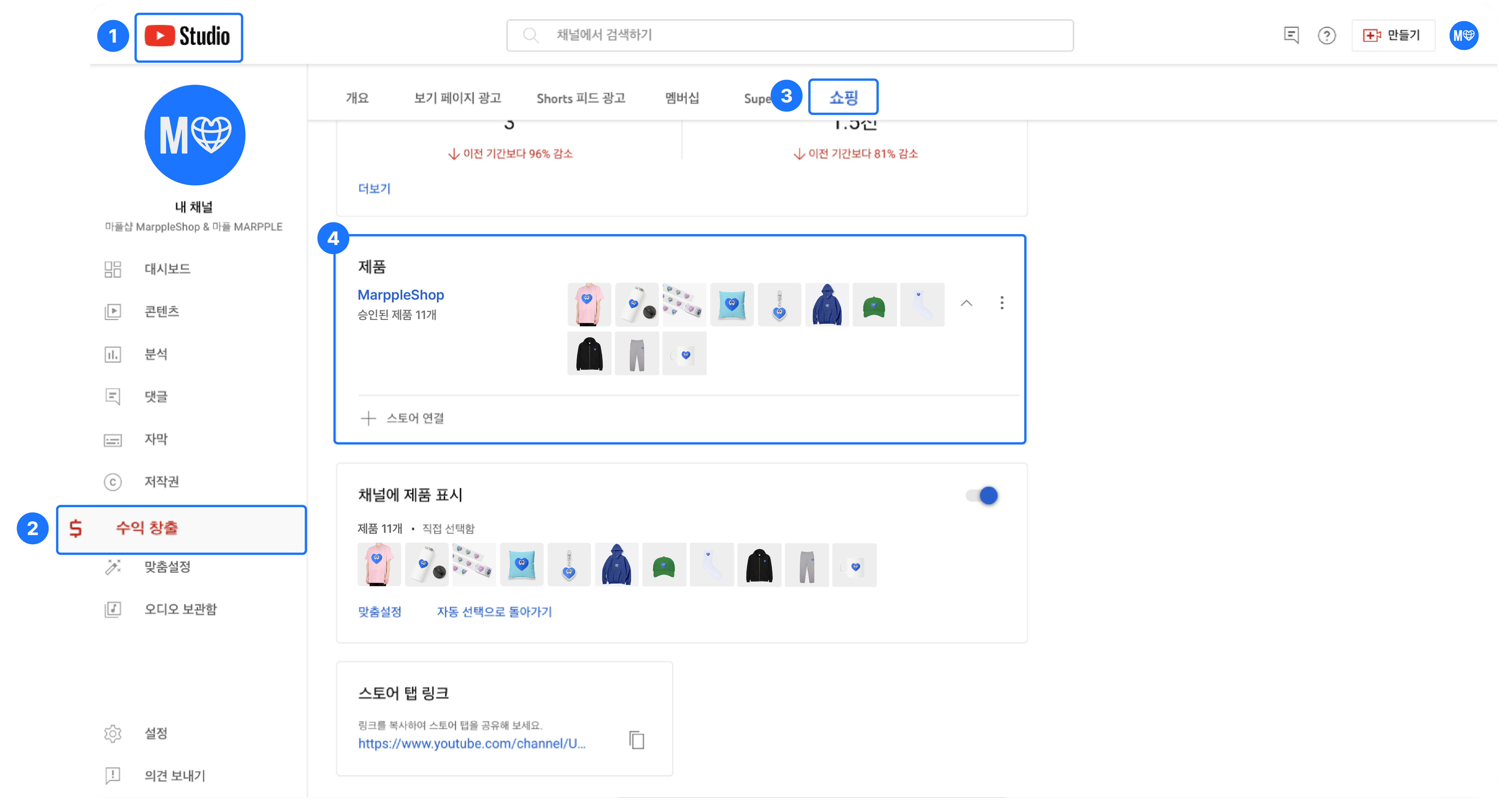 [유튜브 스튜디오] > [수익 창출] > [Shopping] > 내 스토어의 제품 추가 - [스토어 연결]로 이동해 주세요.