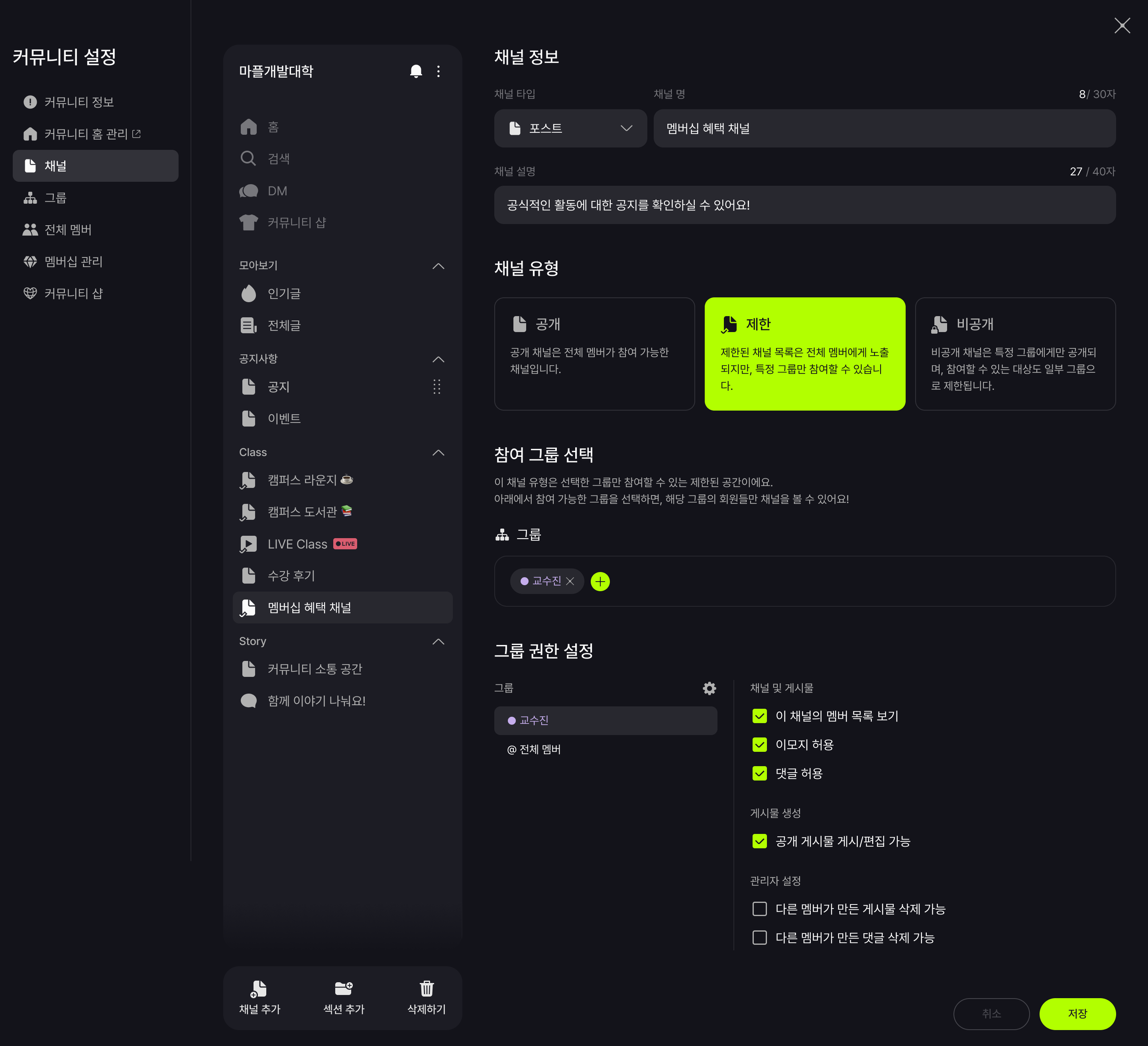 사이어티 커뮤니티 설정에서 커뮤니티 내 다양한 채널 유형과 권한을 설정할 수 있습니다.