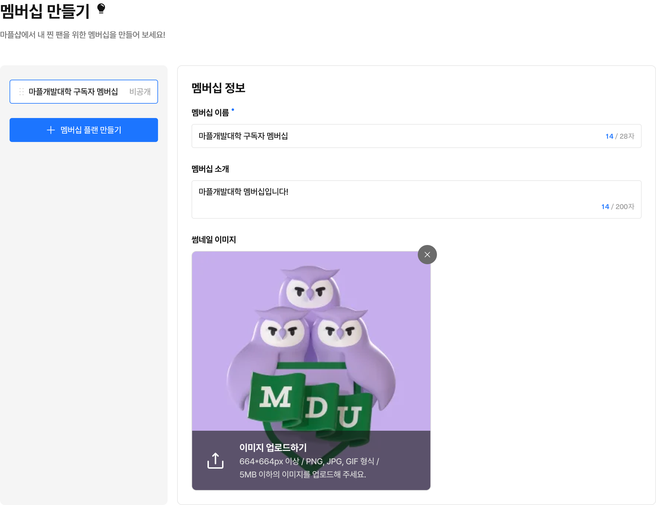 [+멤버십 플랜 만들기]를 통해 새로운 멤버십을 개설할 수 있습니다.
