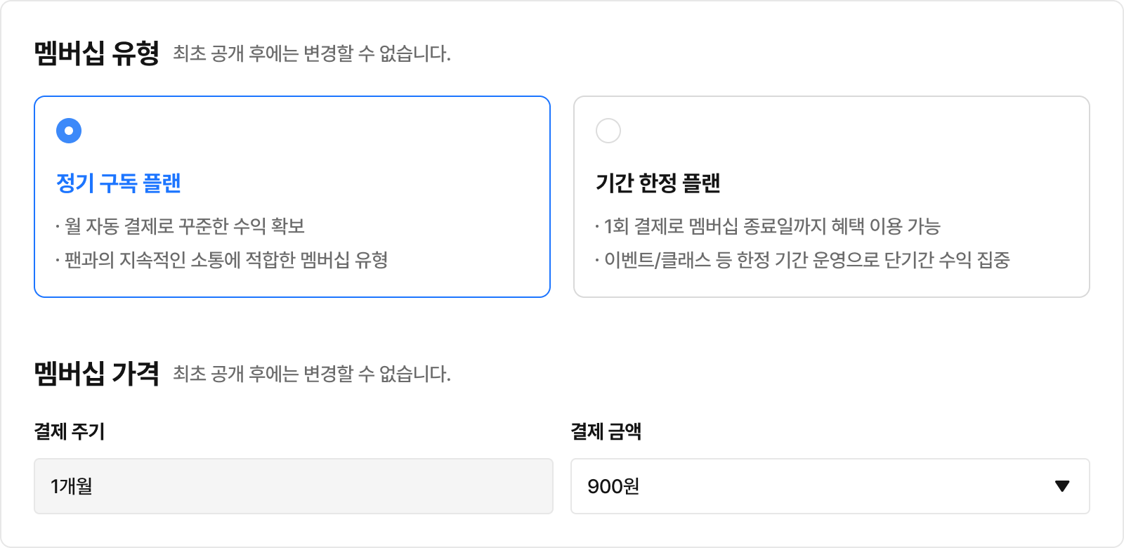 결제 금액: 멤버십 가입 시 1회성으로 결제될 플랜 가격을 설정해 주세요. 최초 공개 이후 가격은 변경할 수 없습니다.