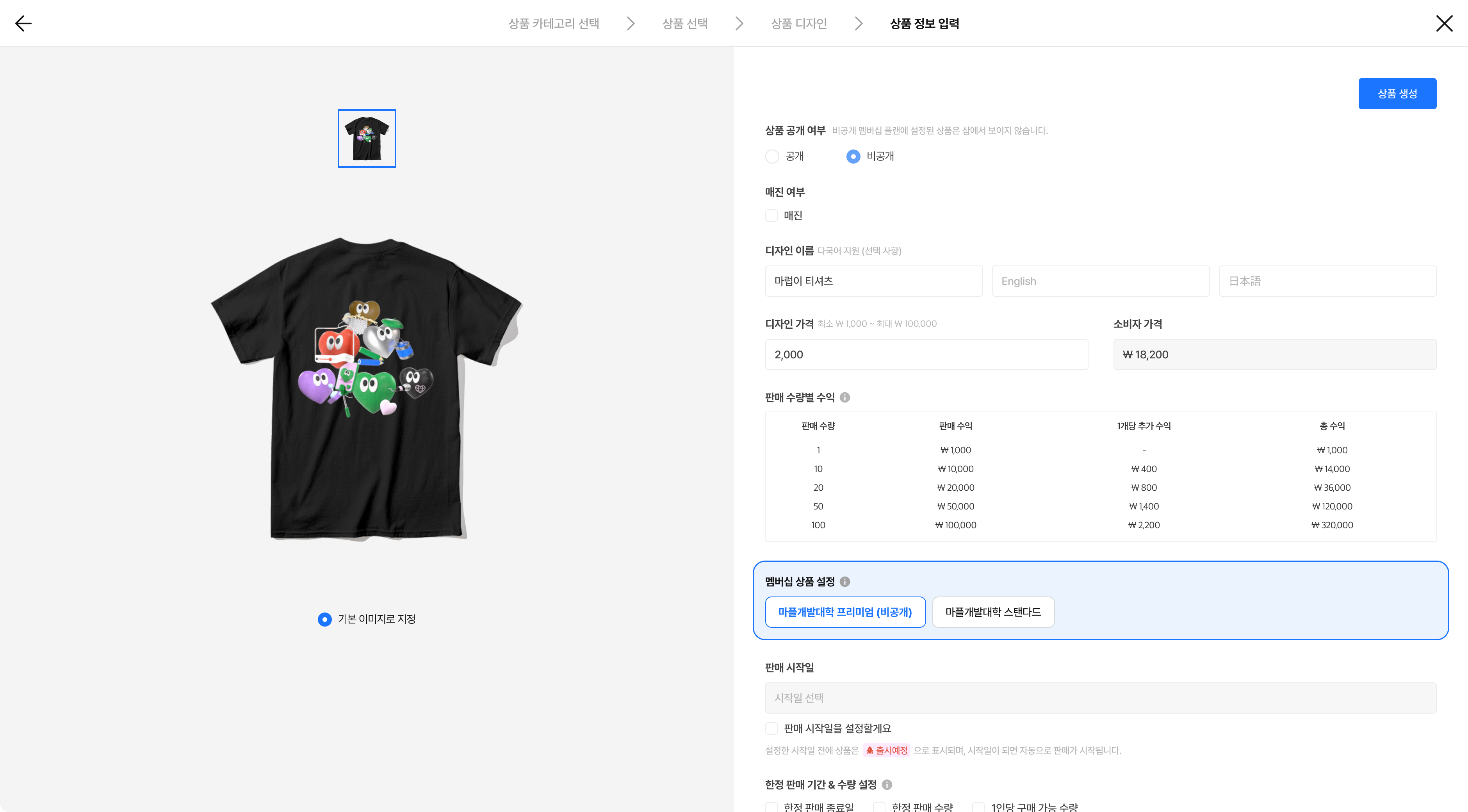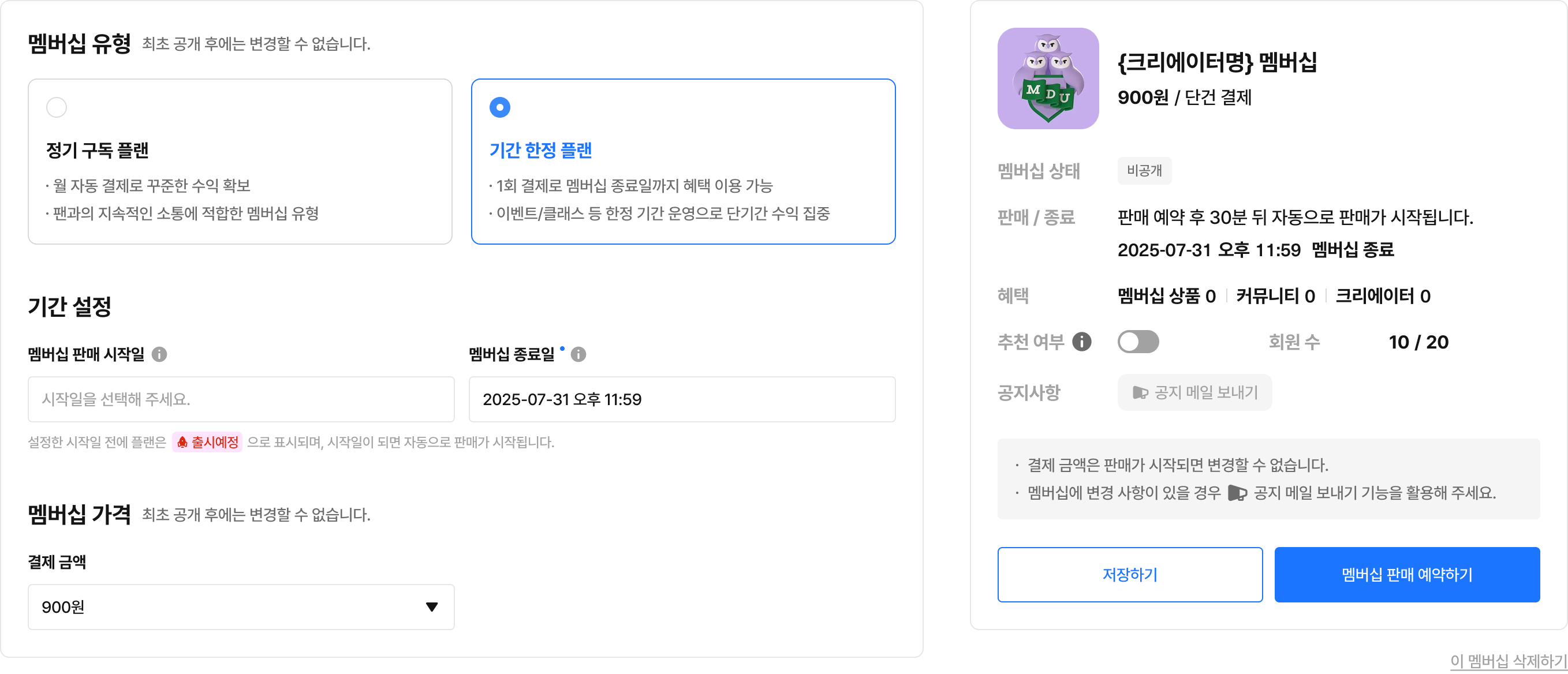 멤버십 공개 전, 판매 시작 시점을 미리 설정하고자 한다면 판매 시작 일시를 설정해 주세요.