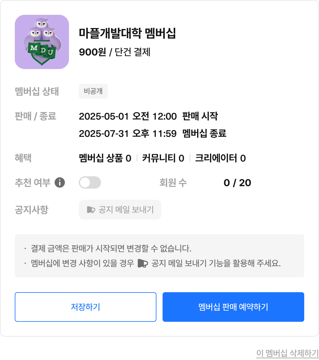 가격 수정을 희망하는 경우 새로운 멤버십 플랜을 생성해야 하므로 신중하게 선택해 주세요.