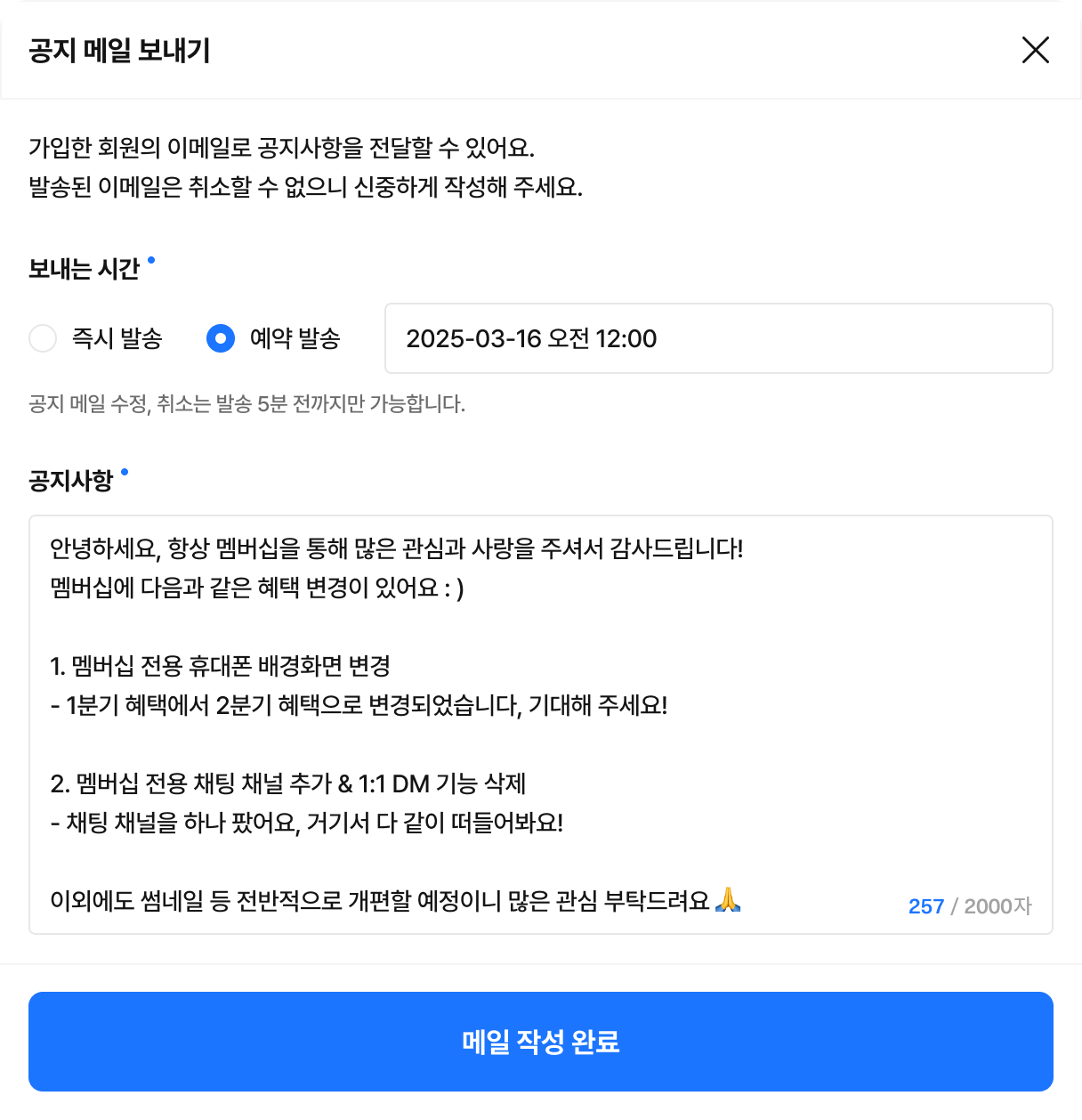 멤버십 혜택에 변경사항이 발생하는 경우, 모든 가입자가 변경 내용을 알 수 있도록 공지 메일 보내기 기능을 통해 알려주세요.