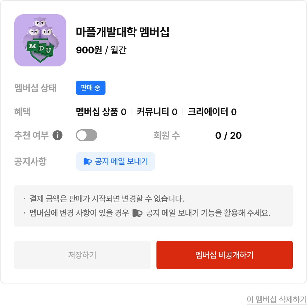 만들기 완료 후 공개된 멤버십 플랜은 가격 수정이 불가합니다.