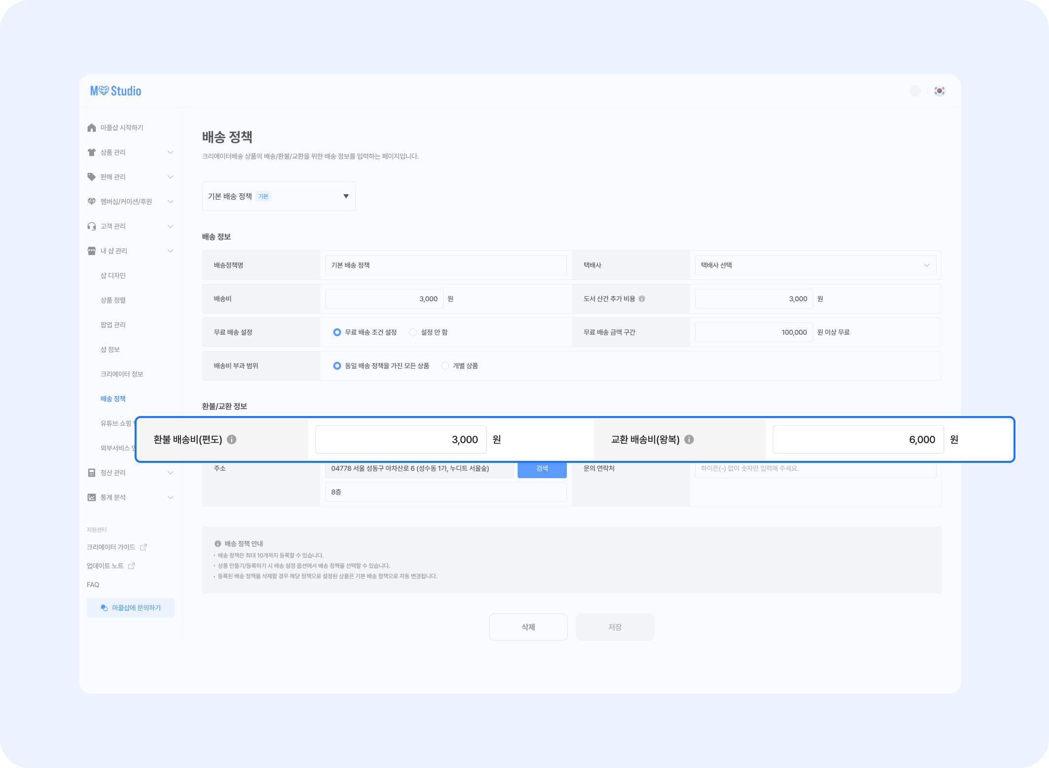 환불/교환 처리 시 필요한 비용은 내 샵 관리 > 배송 정책에서 설정할 수 있습니다.
