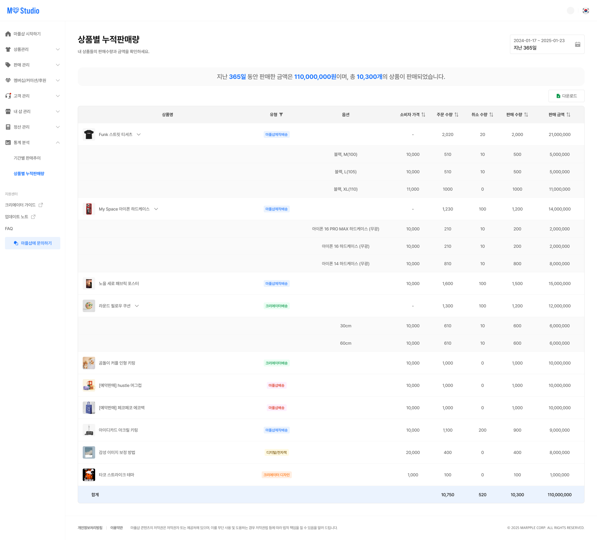 크리에이터 샵에서 판매된 상품별 누적 판매량과 기간별 수익을 확인해 보세요.