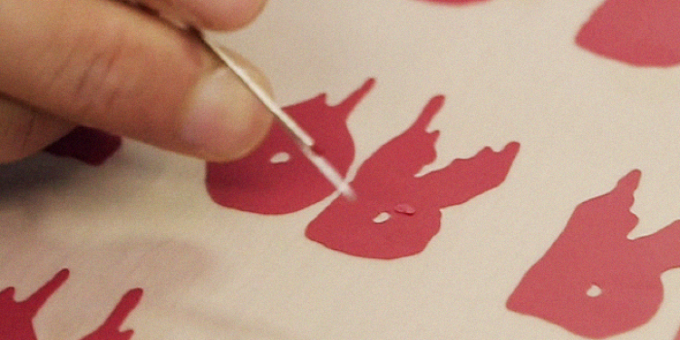 얇은 고무 원단(시트)을 기계로 커팅하여 고온 압착하는 인쇄 방식