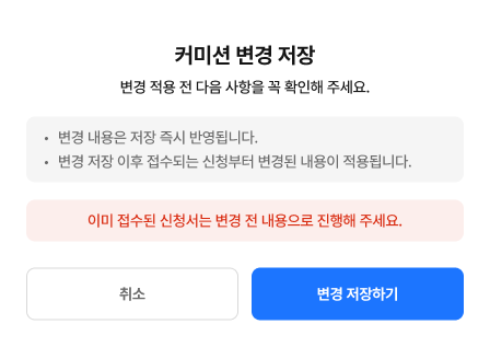결제 금액을 제외한 다른 상세가 변경되는 경우, 변경 시점 이전 접수된 신청서는 이전 커미션 정보로 유지됩니다.