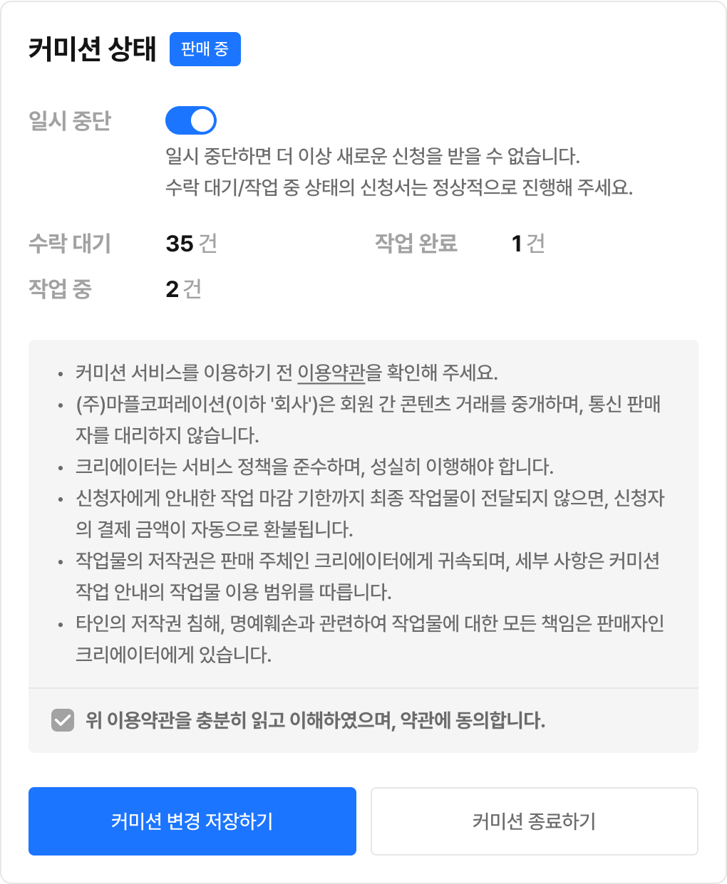 수락 대기,작업 중,작업 완료상태가 있는 커미션은 종료할 수 없습니다.종료 상태여도 샵 커미션 목록에서는 계속해서 노출됩니다.