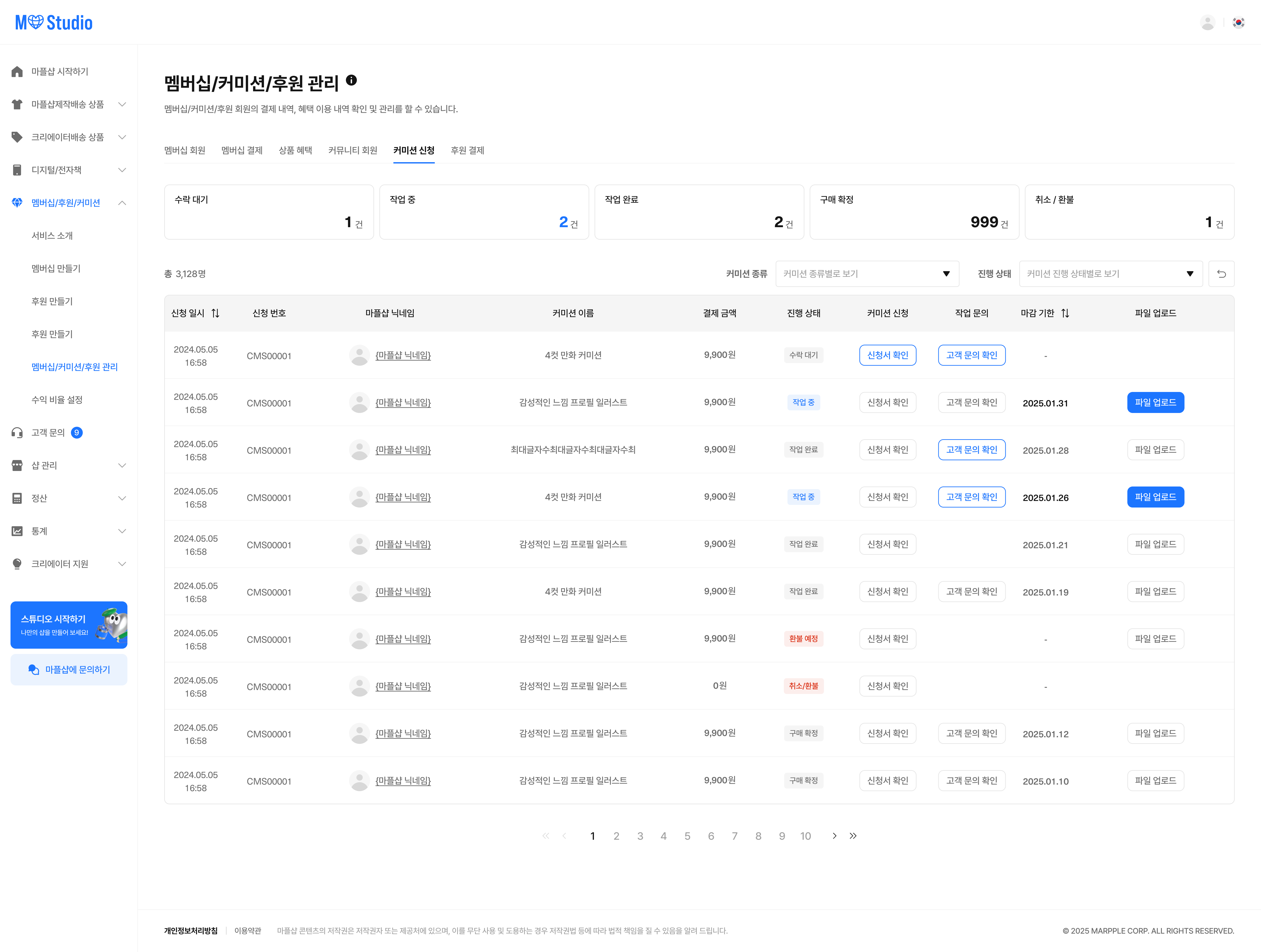 [샵 스튜디오] > [멤버십/커미션/후원] > [멤버십/커미션/후원 관리] > [커미션 신청] 탭에서 전체 커미션 신청서를 확인하고 관리할 수 있습니다.
