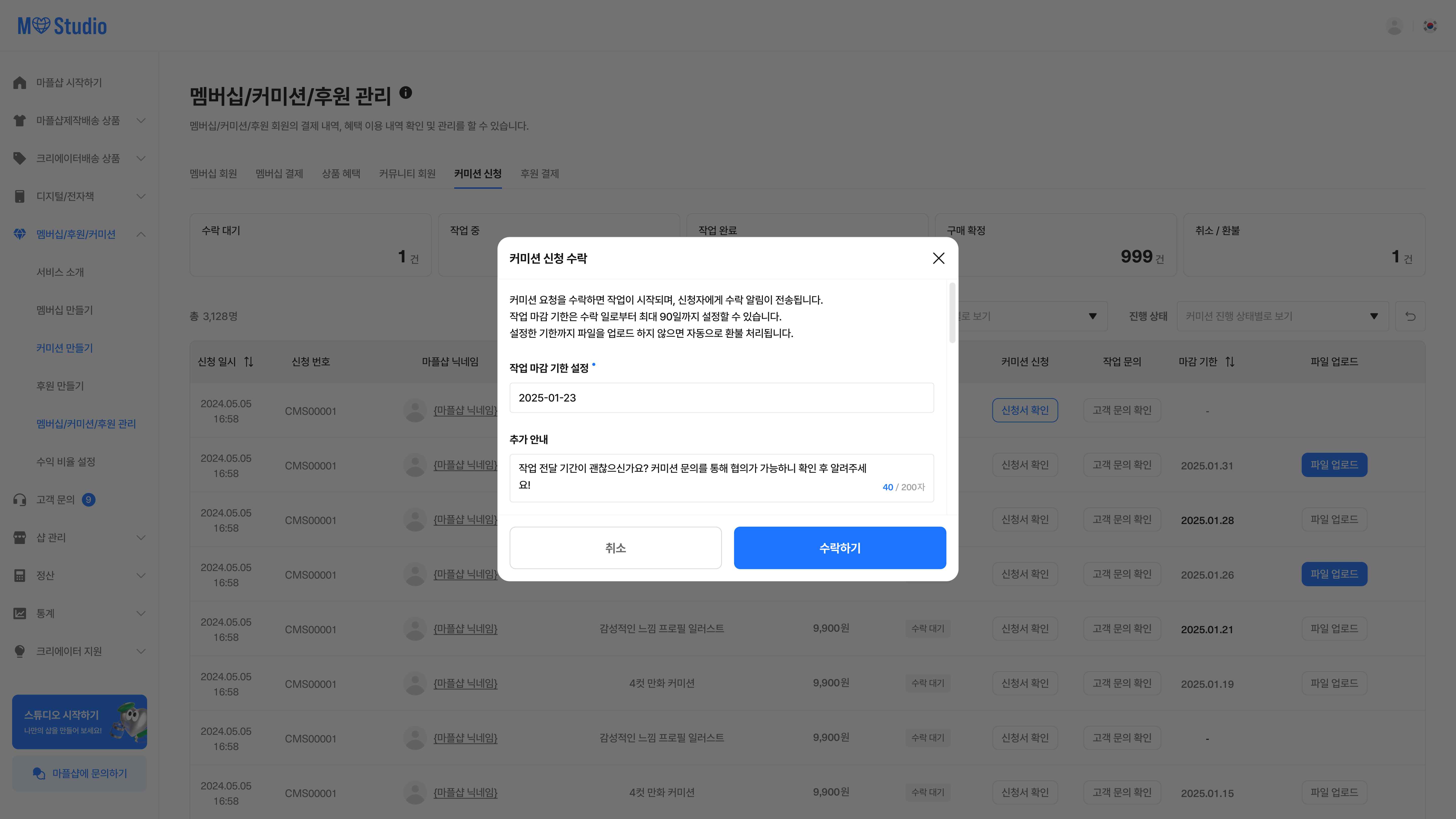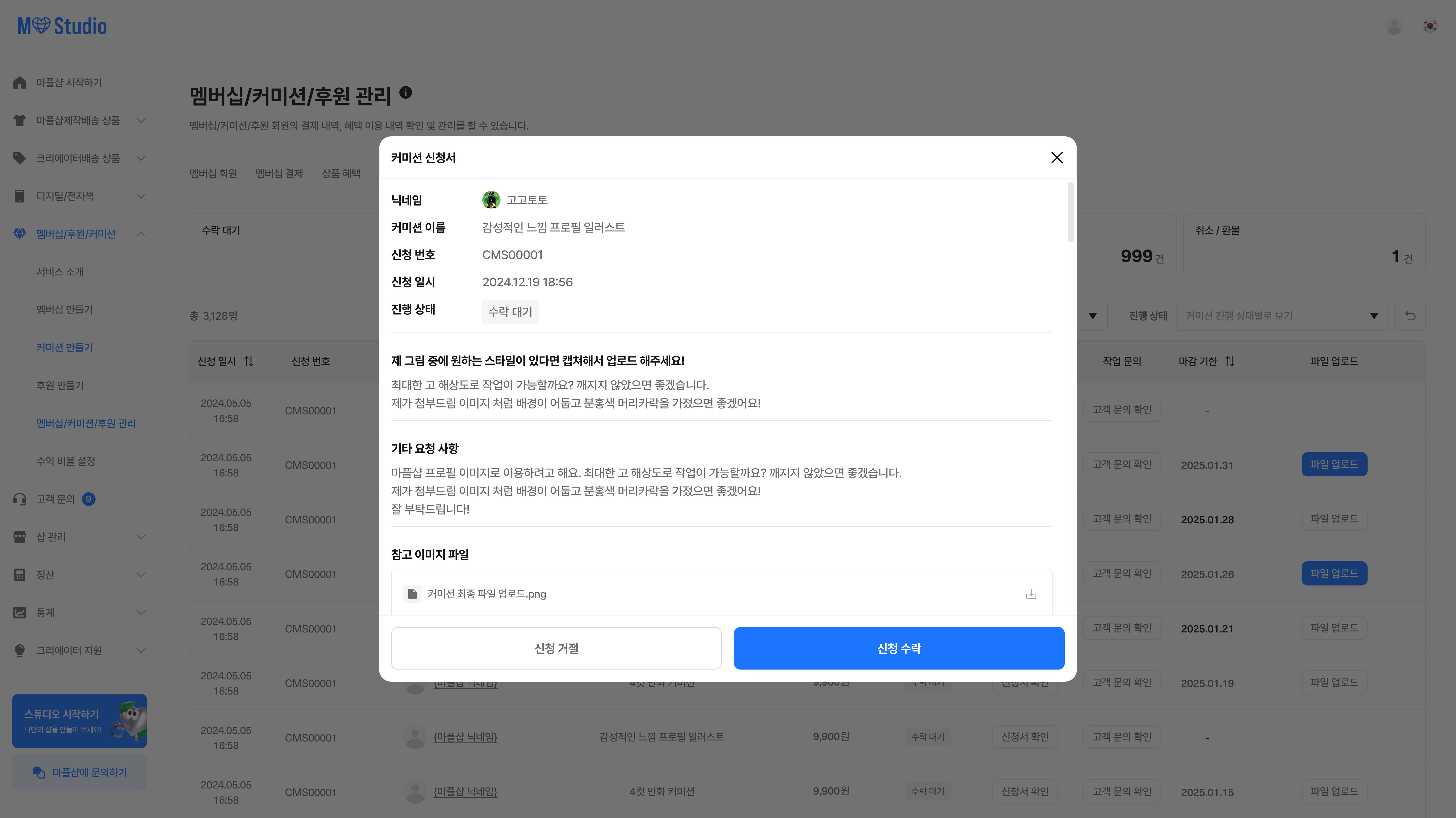 [샵 스튜디오] > [멤버십/커미션/후원] > [멤버십/커미션/후원 관리] > [커미션 신청] 탭에서