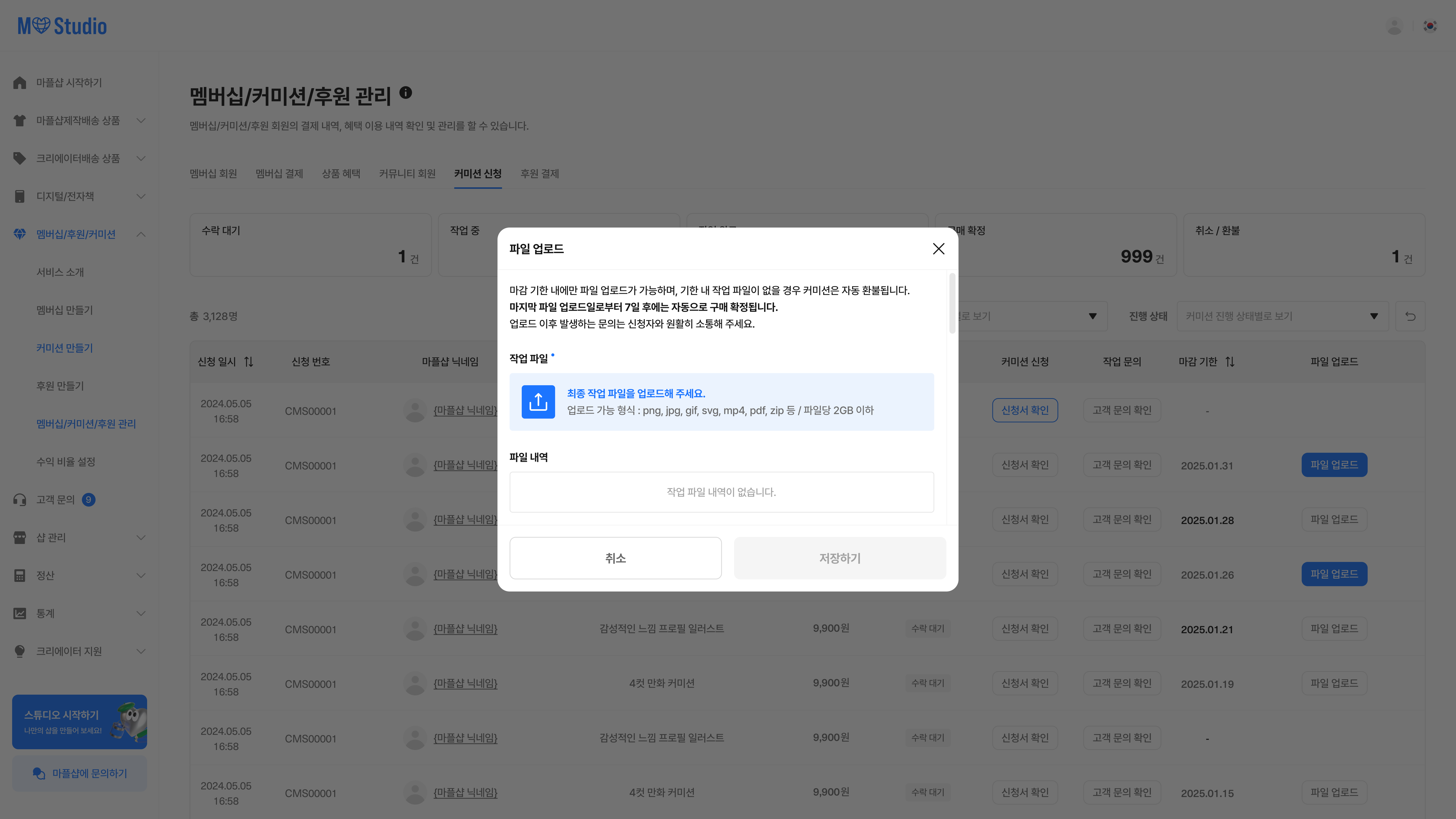 [샵 스튜디오] > [멤버십/커미션/후원] > [멤버십/커미션/후원 관리] > [커미션 신청] > 작업 중 혹은 작업 완료 신청서에 작업물 파일을 업로드할 수 있습니다.