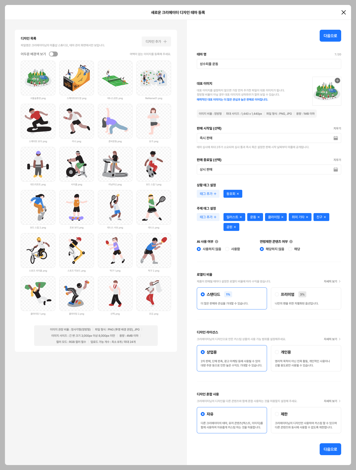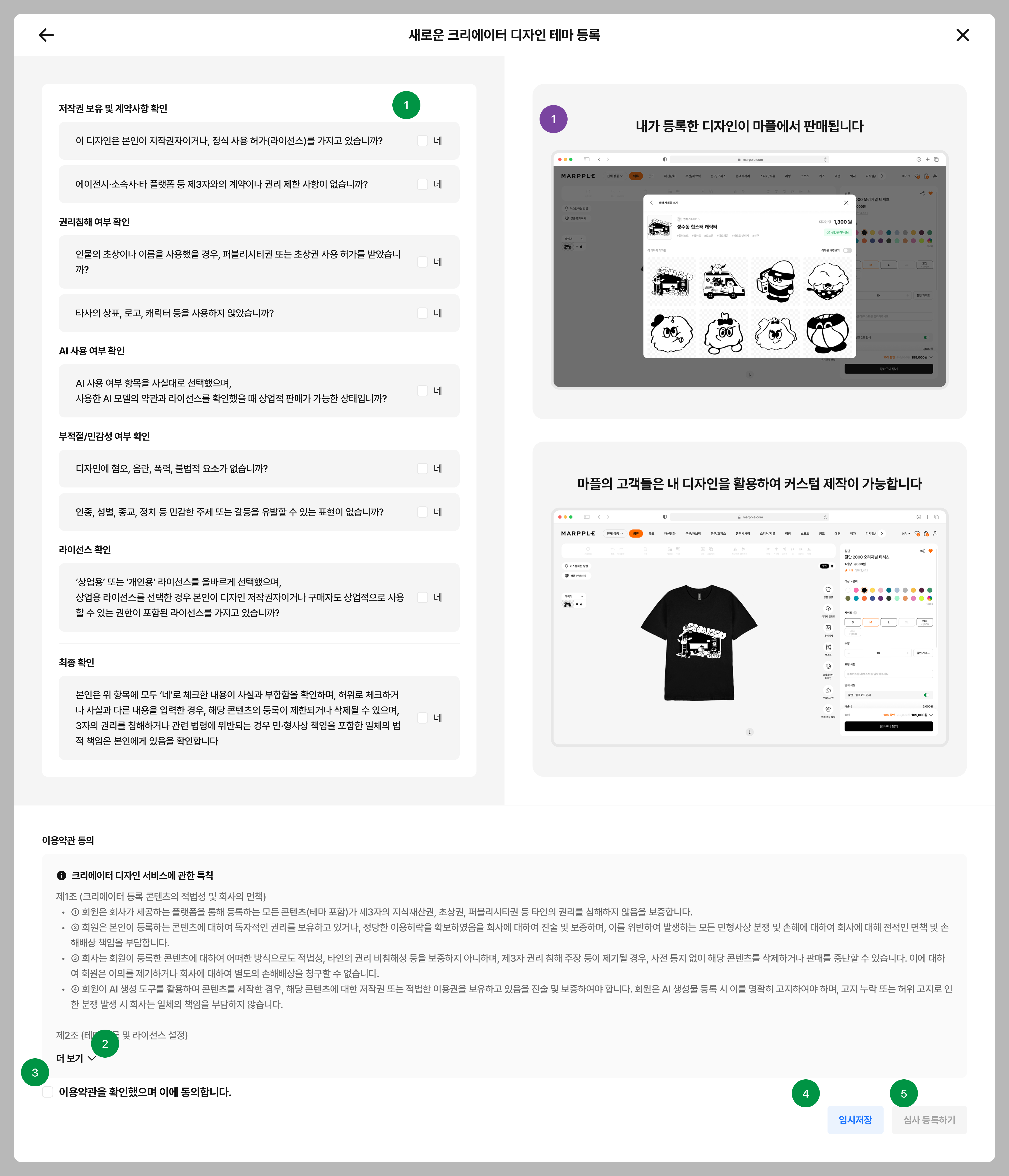 모든 크리에이터는 크리에이터 디자인 테마 판매를 위해 자가 점검 리스트를 확인하고 이용 약관에 동의하여야 합니다.
