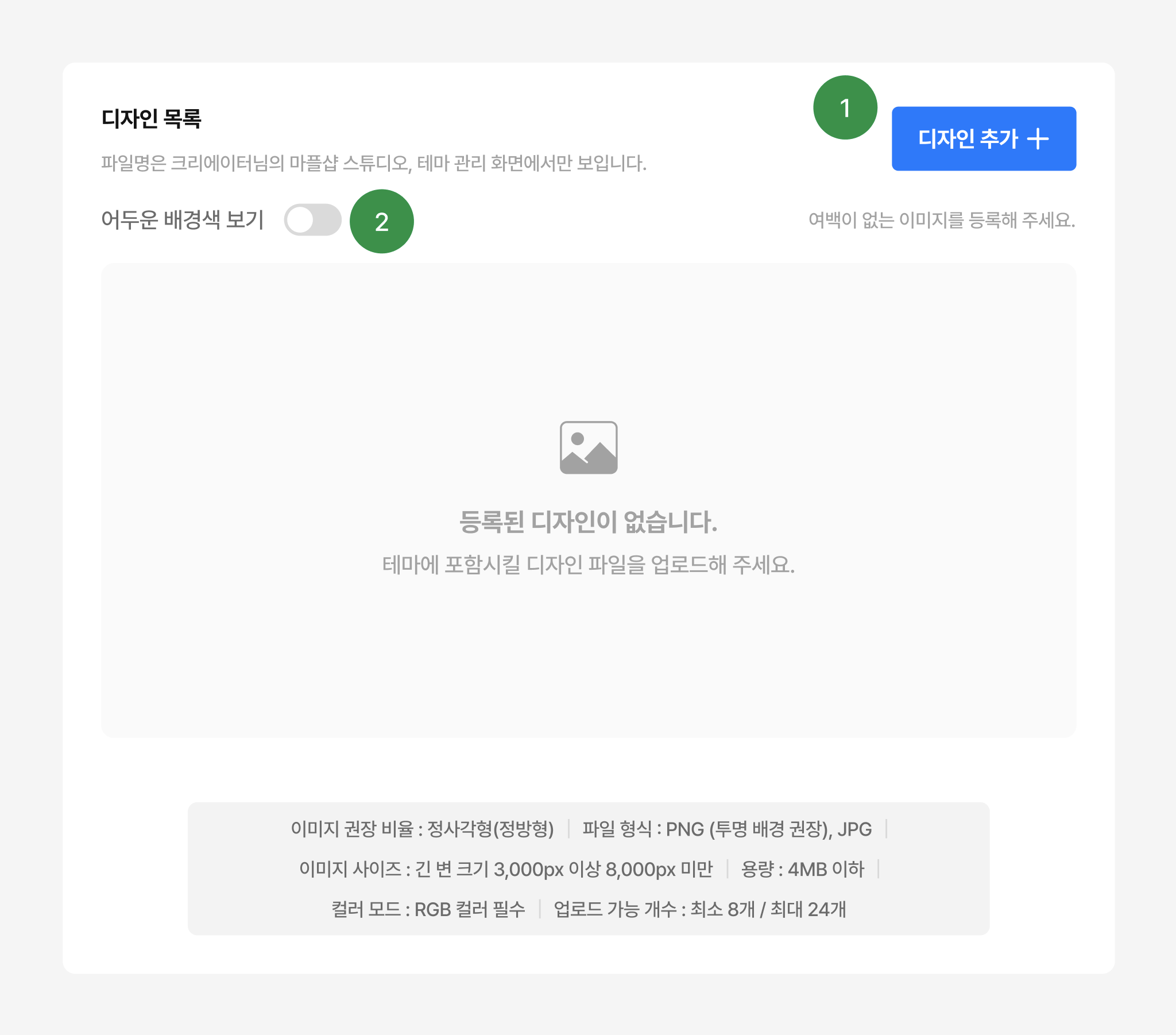 1개 테마 당 최소 8개 ~ 최대 24개의 디자인을 등록할 수 있습니다.
