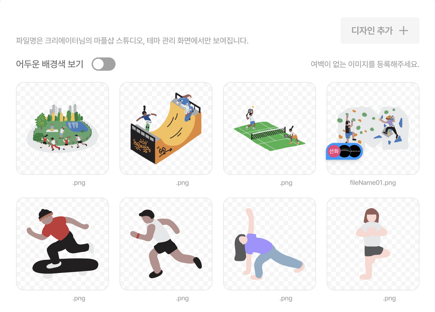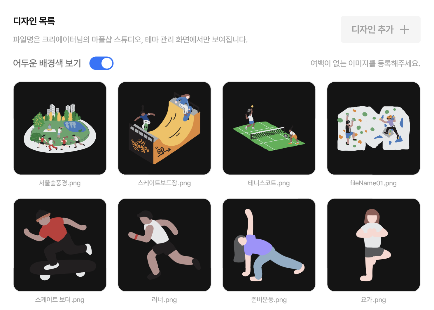 [디자인 추가 +] 버튼을 통해 크리에이터 디자인을 등록해 보세요.