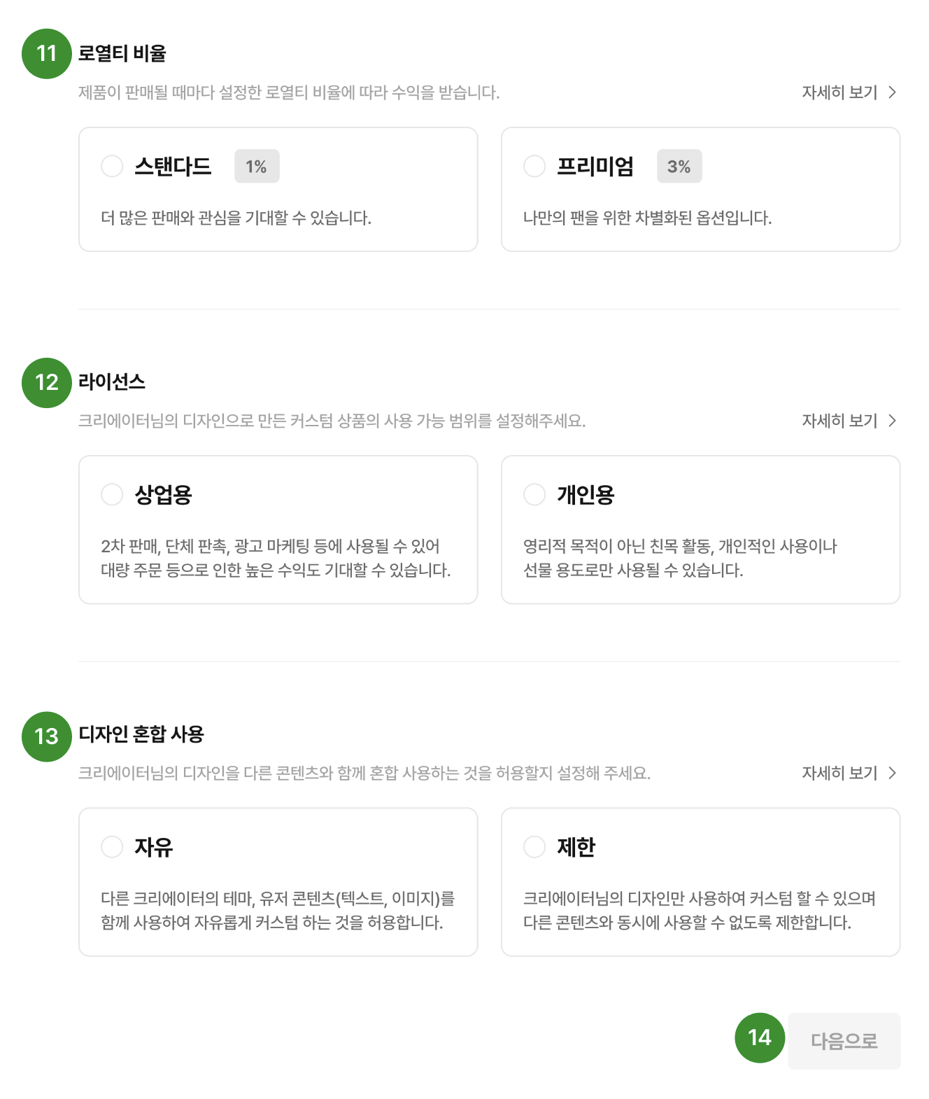크리에이터 디자인 수익 책정 기준인 로열티 비율을 선택해 주세요.