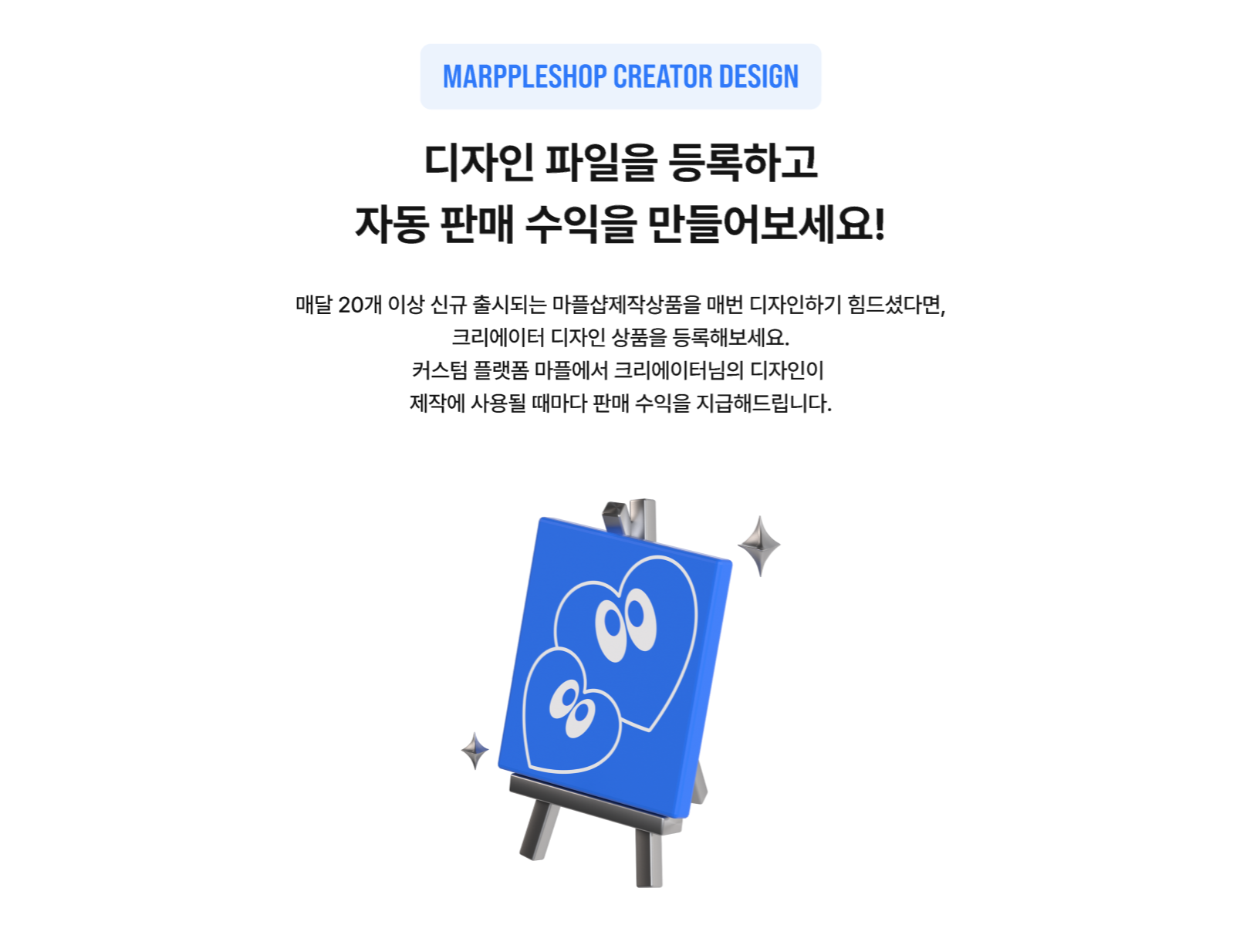 크리에이터는 보유한 디자인/캐릭터 등 이미지 에셋을 마플샵에 등록하고 판매를 시작하면 마플에서의 커스텀 상품 제작에 사용될 때마다 로열티를 획득할 수 있습니다.