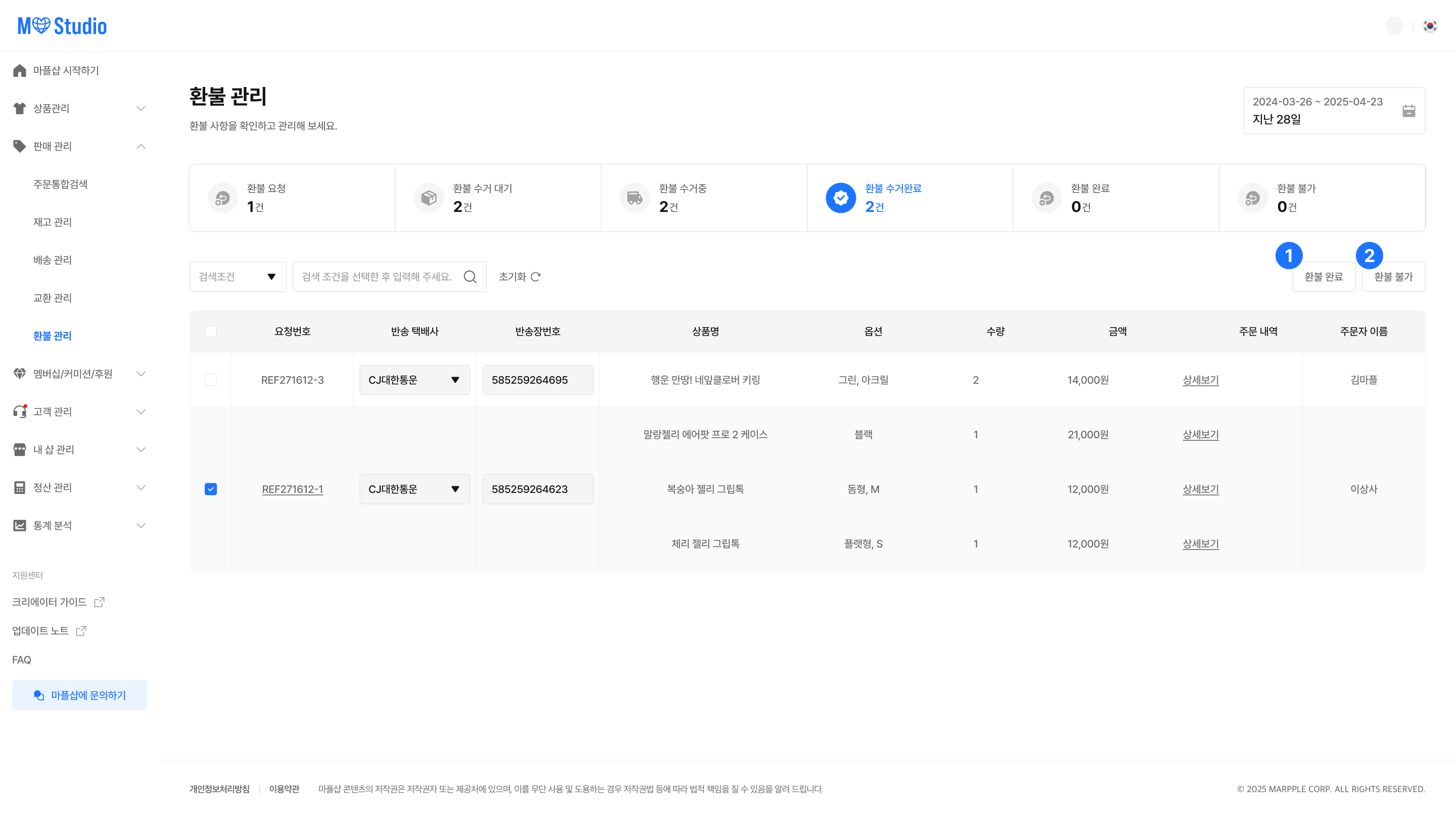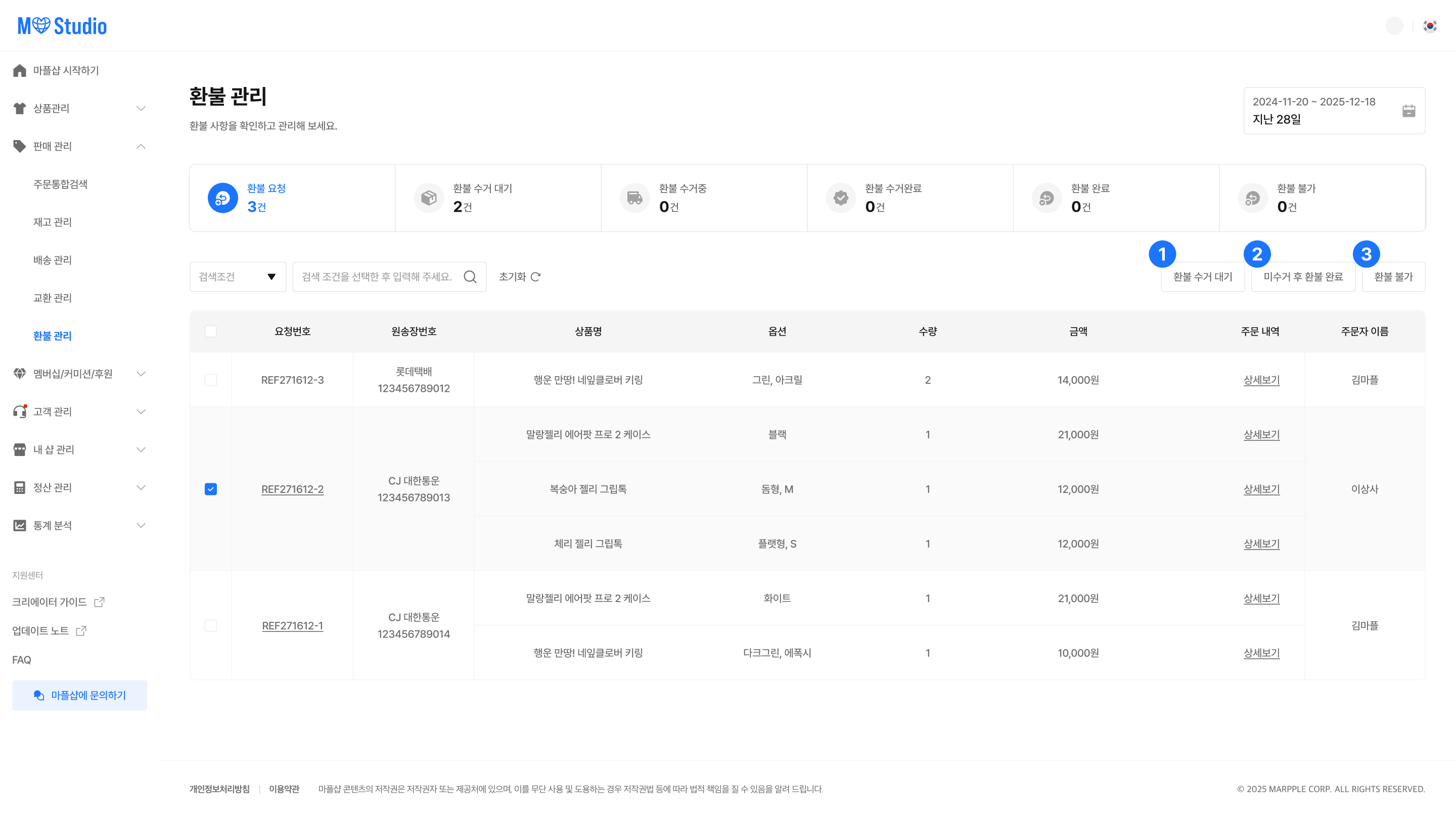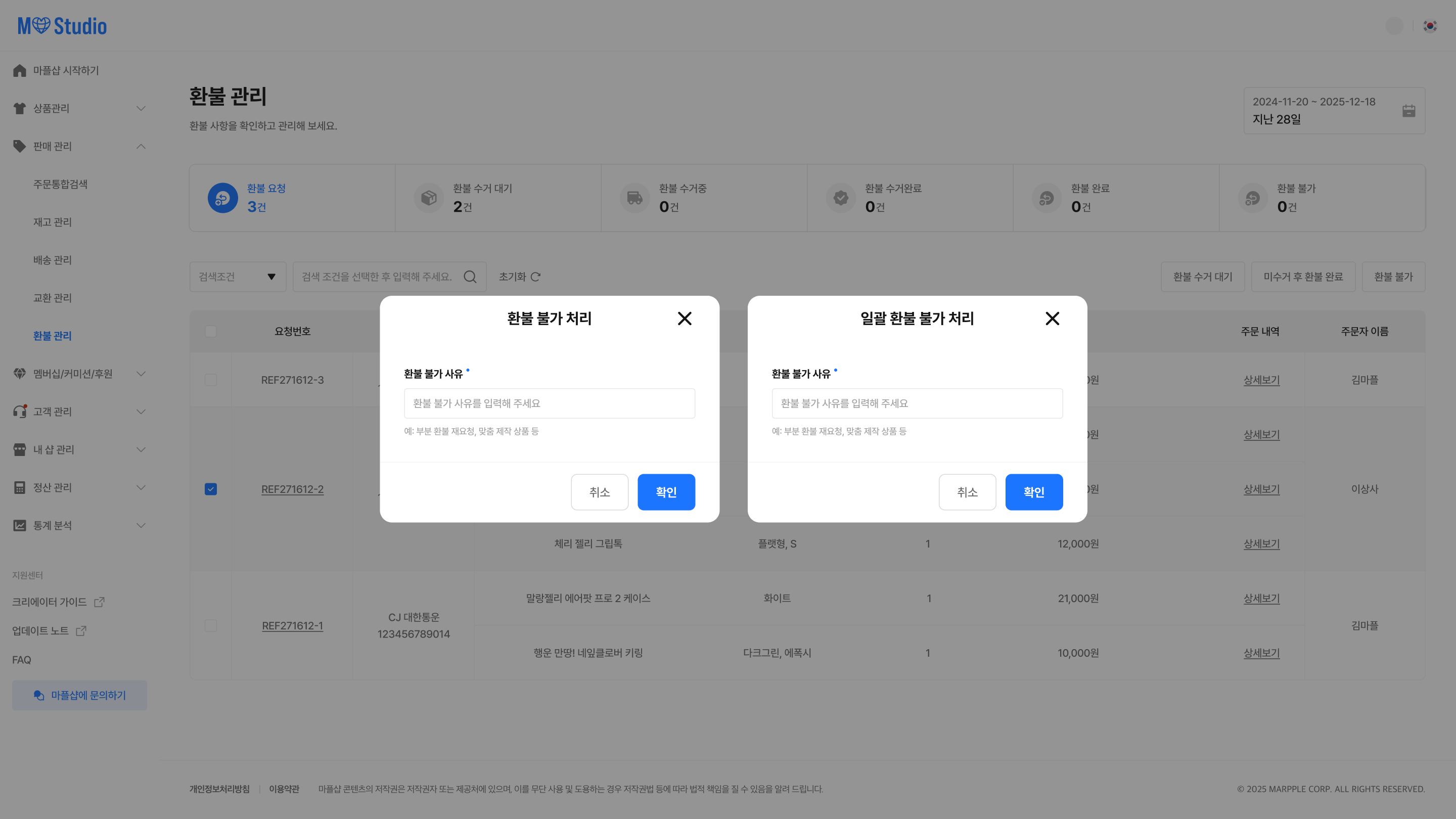 크리에이터 배송 상품에 대한 환불 요청이 접수되면, 판매자는 환불 관리 페이지에서 요청 사유와 수량을 확인한 뒤 환불 승인 또는 환불 불가 처리 및 상태 변경을 진행할 수 있습니다.