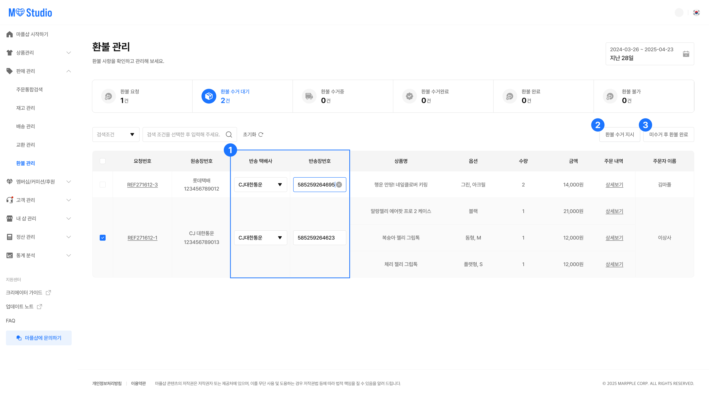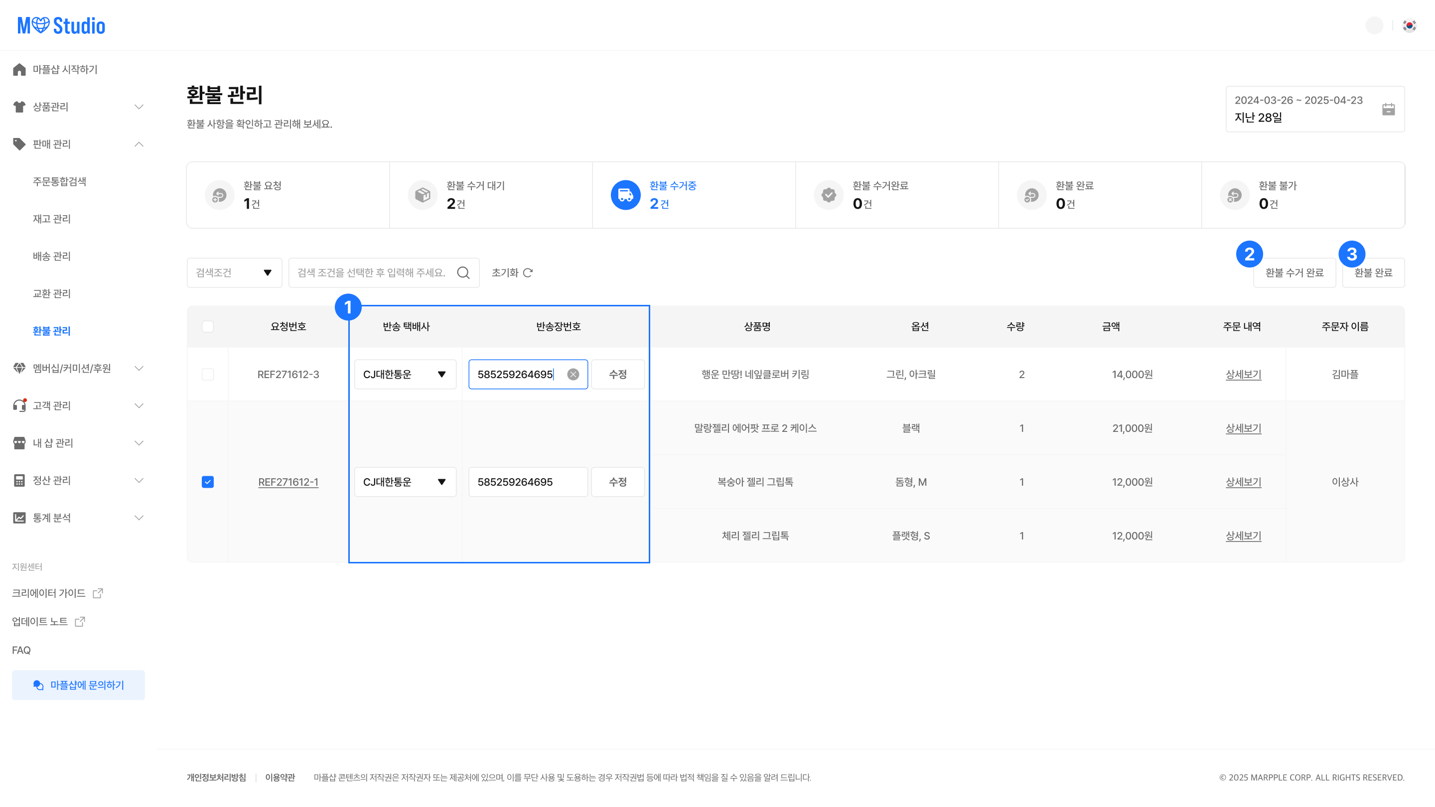 요청을 ‘환불 수거 대기’로 전환한 뒤 반송장 정보를 등록하여 수거 절차를 진행해 주세요.
