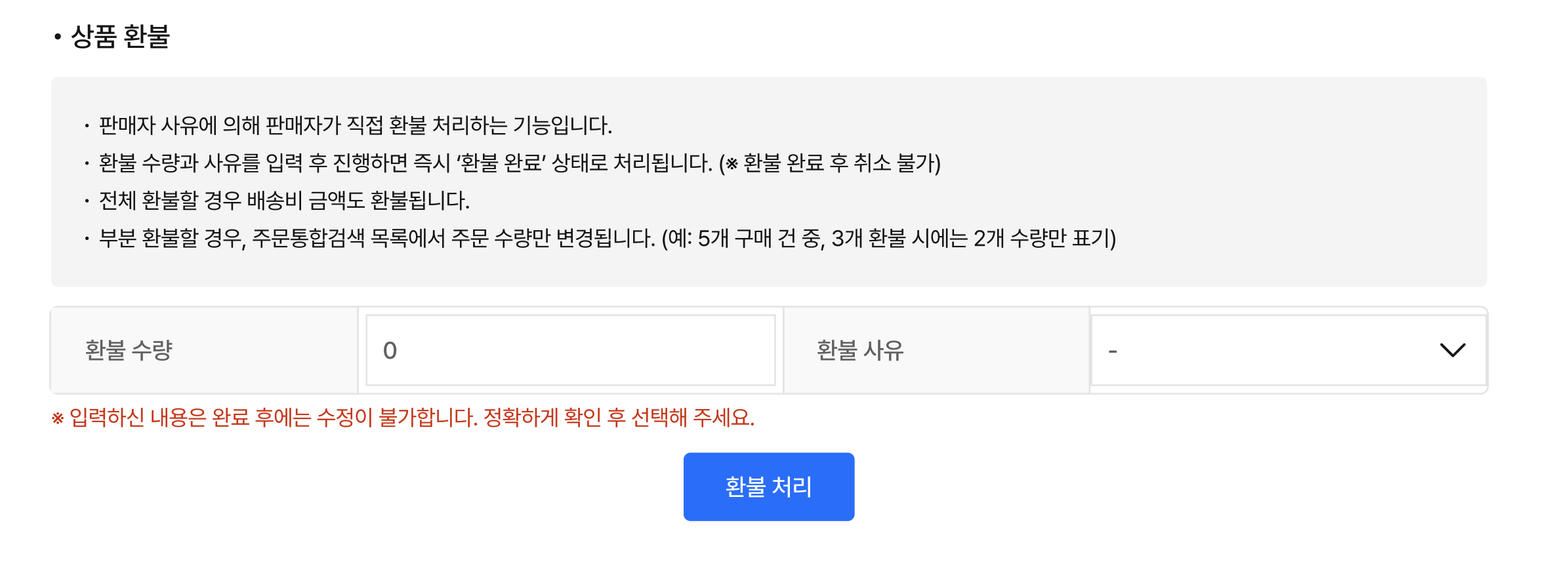 요청 단위로만 처리되며 부분 환불이 불가합니다.일부 상품만 환불이 필요한 경우, 전체 요청을 ‘환불 불가’로 처리한 뒤 환불 가능한 수량 또는 옵션을 고객에게 별도로 안내해 주세요.