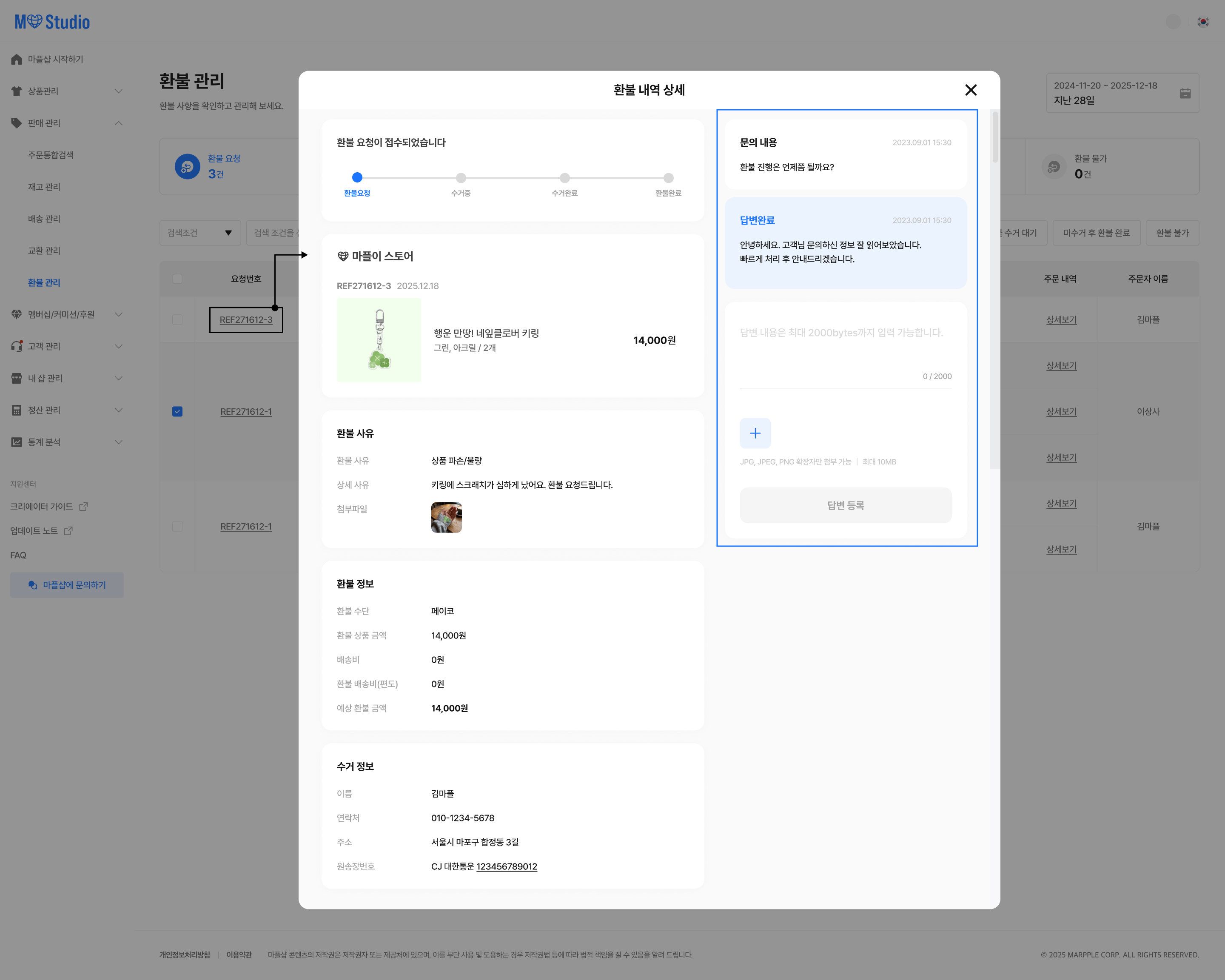 해당 화면에서 환불 진행 상태를 확인하고 고객 문의에 답변을 작성할 수 있습니다.